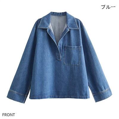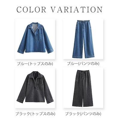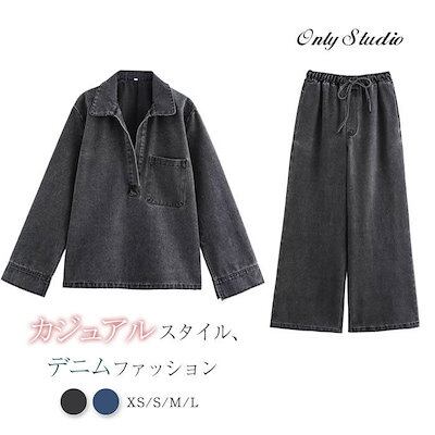 セットアップ デニム レディース 新作 パンツセット デニムシャツ ワイド ロング パンツ 長袖 無地 綿 折り襟 ストレートパンツ プルオーバー スリット 洗える デザイン感 カジュアル 上下セット
