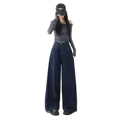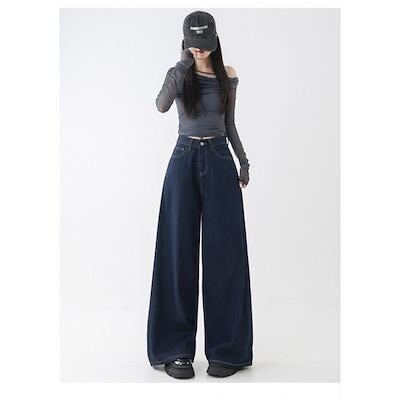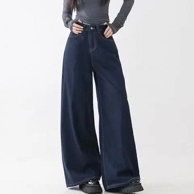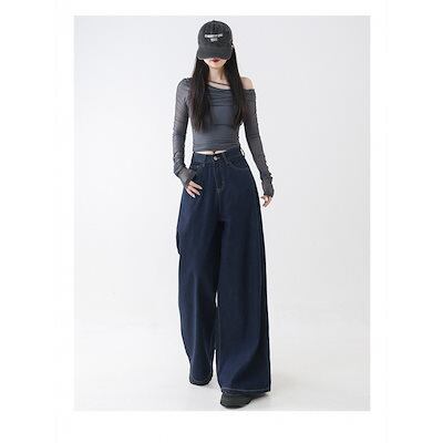 ダークブルーのハイウエストゆったりとしたドレープレイジーカジュアルモッピングパンツストレートな洋ナシ型の万能ワイドレッグデニムパンツ(レディース)