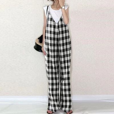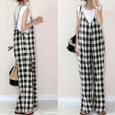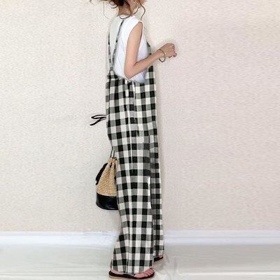 2025 夏 ニュースタイル ゆったり ハイウエスト サロペット チェック カジュアルパンツ ワイドパンツ サロペット 着痩せ 韓国ファッション 2025福袋
