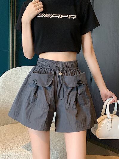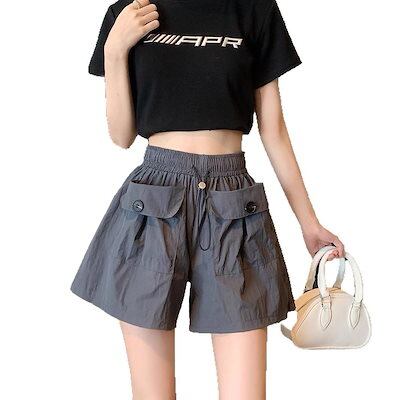 ハーフパンツ ハイウエストカジュアルショーツ女性夏新しいワイドレッグドローストリングズボン