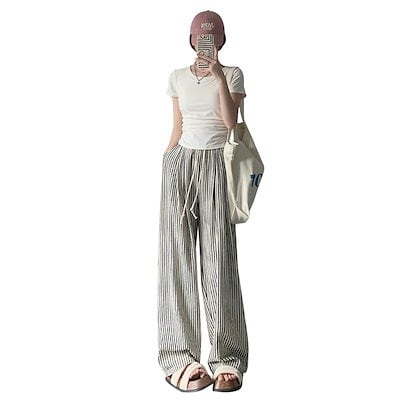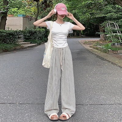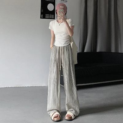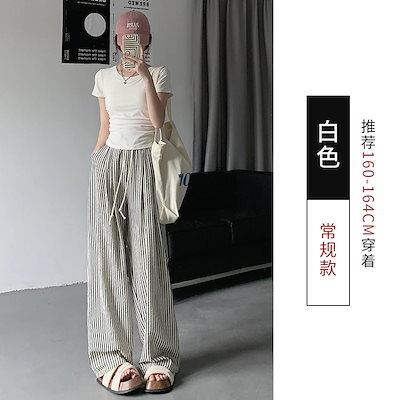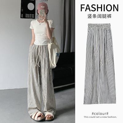 ワイドパンツ 新作2色縦縞細ハイウエストカジュアルワイドパンツ