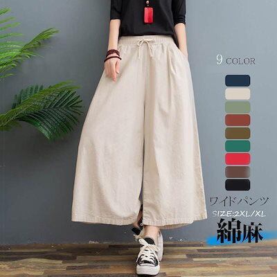 ワイドパンツ 春 夏 秋 レディース 綿麻 パンツ 春夏 バギーパンツ スカート風 九分丈 ウエストゴム ポケット付き 無地 ゆったり 大きいサイズ 着痩せ 薄手