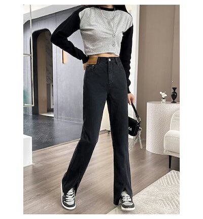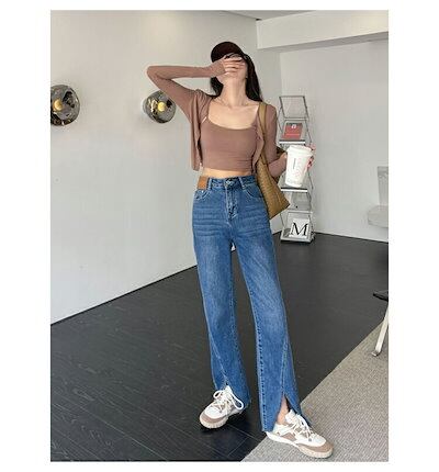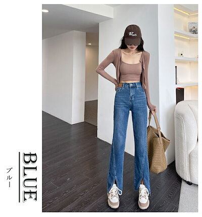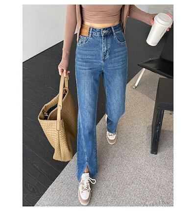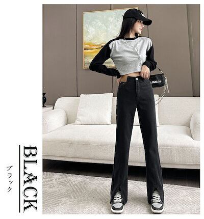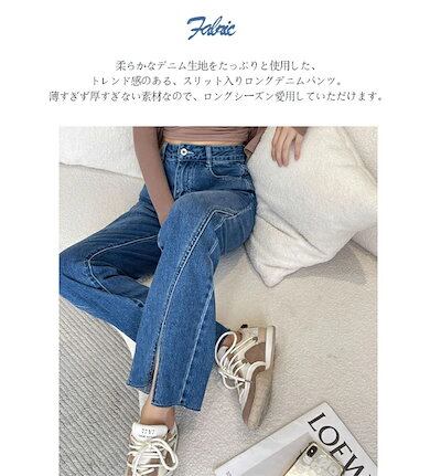 デニムパンツ レディース 大きいサイズ ワイドパンツ デニム きれいめ スリット入り 脚長効果 ロングパンツ 長ズボン ハイウェスト 色落ち加工 ストレートパンツ 黒 美脚 パンツ ワ