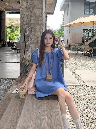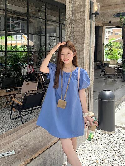 2024 春夏ワンピース 半袖 ミニ丈 Aライン ラウンドネック ゆったり 細見え 夏 青 ブルー シンプル おしゃれ かわいい 無地 韓国ファッション レディース お出かけ