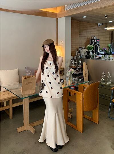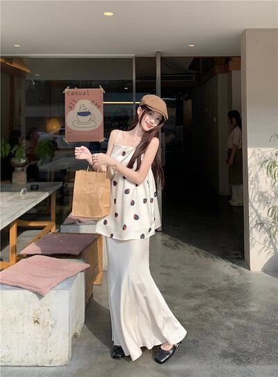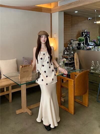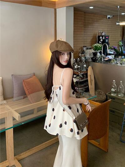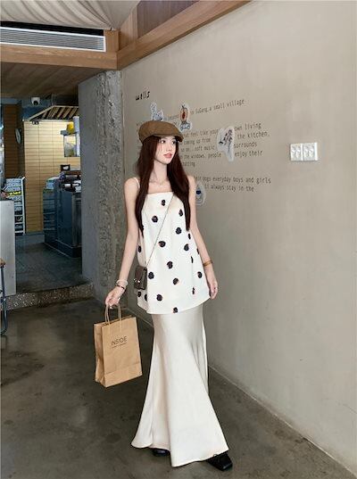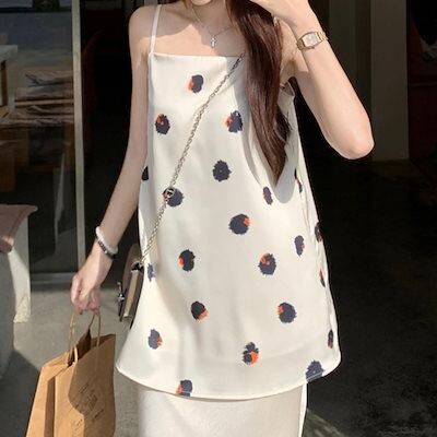 2024 春夏トップス キャミソール ノースリーブ スクエアネック ドット柄 丈長め ゆったり 細見え 夏 白 ホワイト おしゃれ かわいい 韓国ファッション レディース お出かけ
