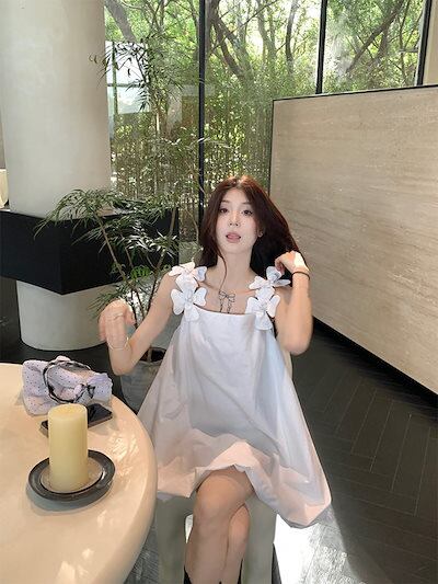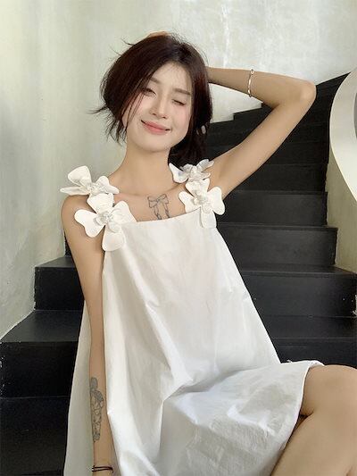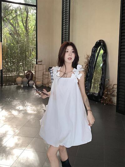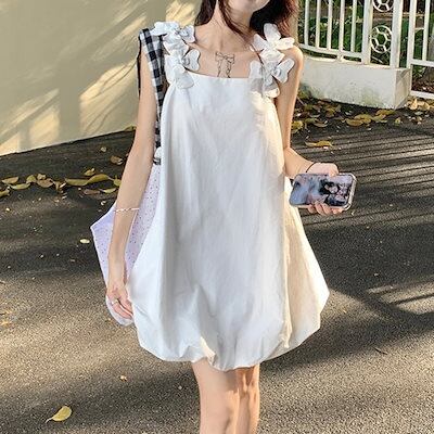 2024春夏ワンピース ノースリーブ スクエアネック ミニ丈 Aライン 花 ゆったり 細見え 夏 白 ホワイト おしゃれ かわいい 甘め キュート ラブリー 韓国ファッション レディース お出かけ