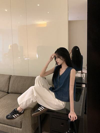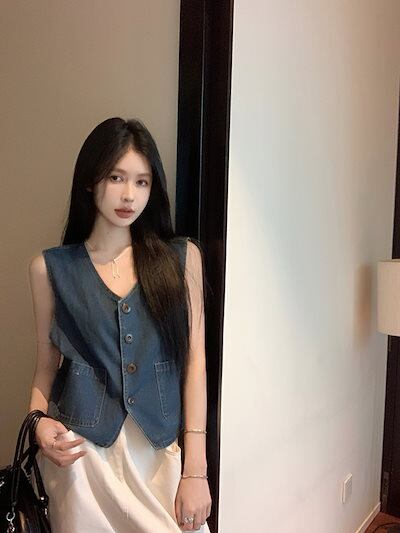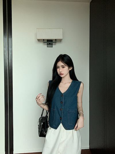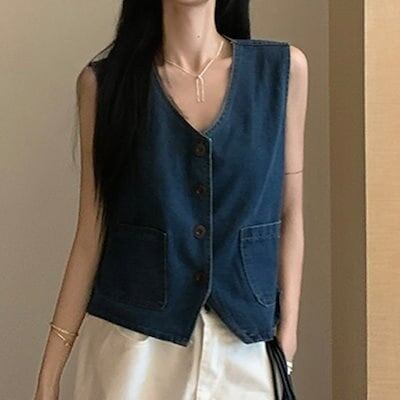 2024春夏トップス ベスト デニム生地 Vネック ノースリーブ ボタン ゆったり 細見え 夏 青 ブルー おしゃれ かわいい 甘め キュート ラブリー 韓国ファッション レディース お出かけ