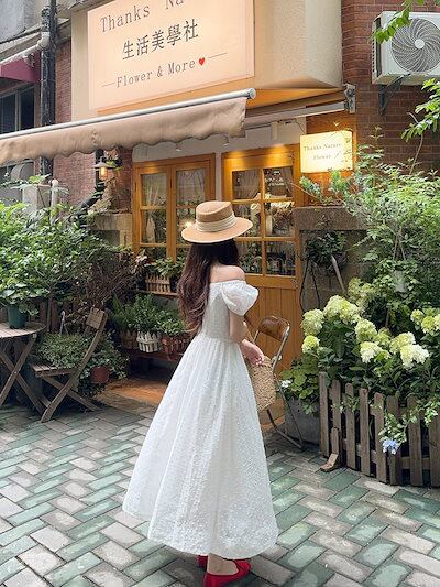 2024春夏ワンピース 半袖 ロング丈 オフショルダー スクエアネック Aライン フレア ゆったり 細見え 夏 白 ホワイト おしゃれ かわいい 甘め キュート ラブリー 韓国ファッション レディース