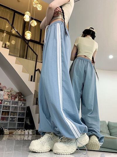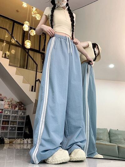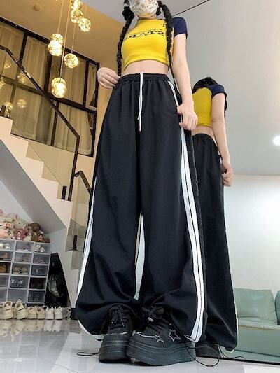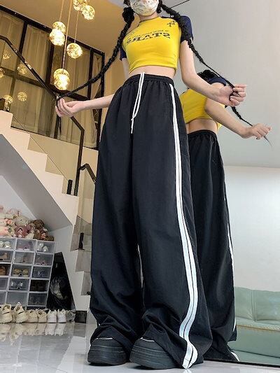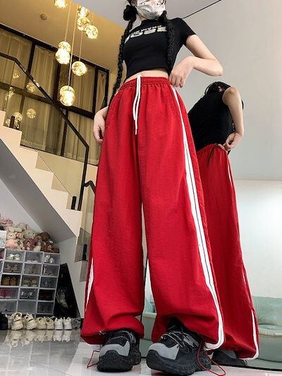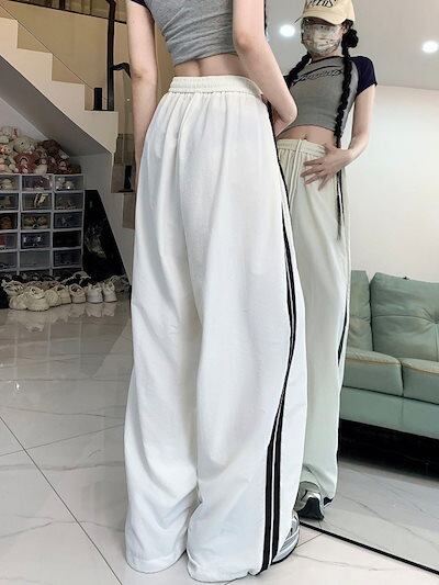 2024 夏 韓国パンツ ロング丈 ウエストゴム ストライプ ワイド ストレート ハイウエスト 美脚効果 脚長効果 細見え 夏 白 黒 赤 おしゃれ かわいい 韓国ファッション レディース お出かけ