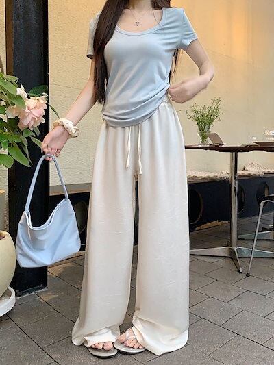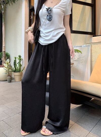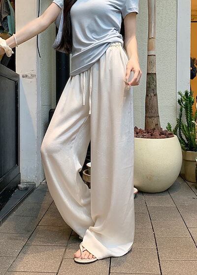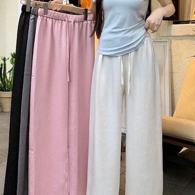 2024 春夏パンツ ロング丈 ウエストゴム ワイド ストレート ハイウエスト 美脚効果 脚長効果 細見え 夏 白 黒 おしゃれ かわいい 韓国ファッション レディース お出かけ