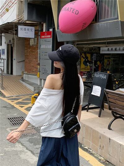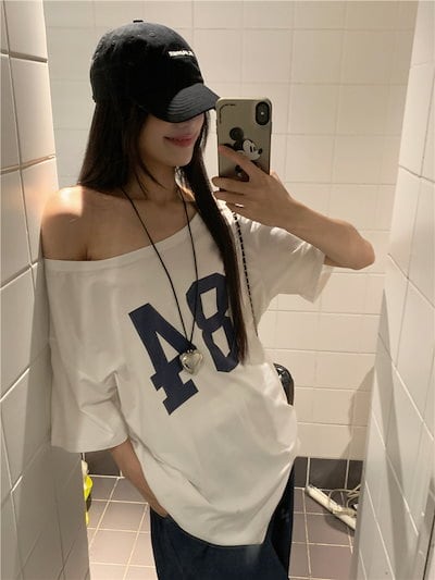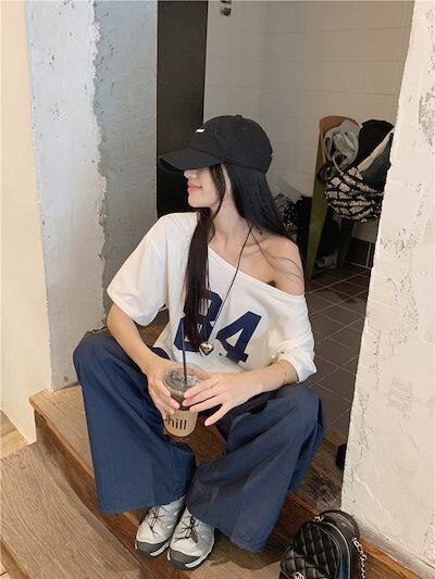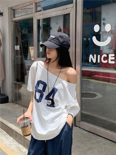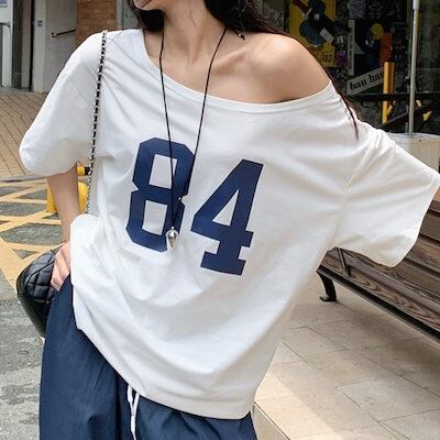 2024 春夏トップス Tシャツ 半袖 数字 84 オフショルダー 肩見せ ゆったり 細見え 夏 白 ホワイト おしゃれ かわいい シンプル 韓国ファッション レディース お出かけ