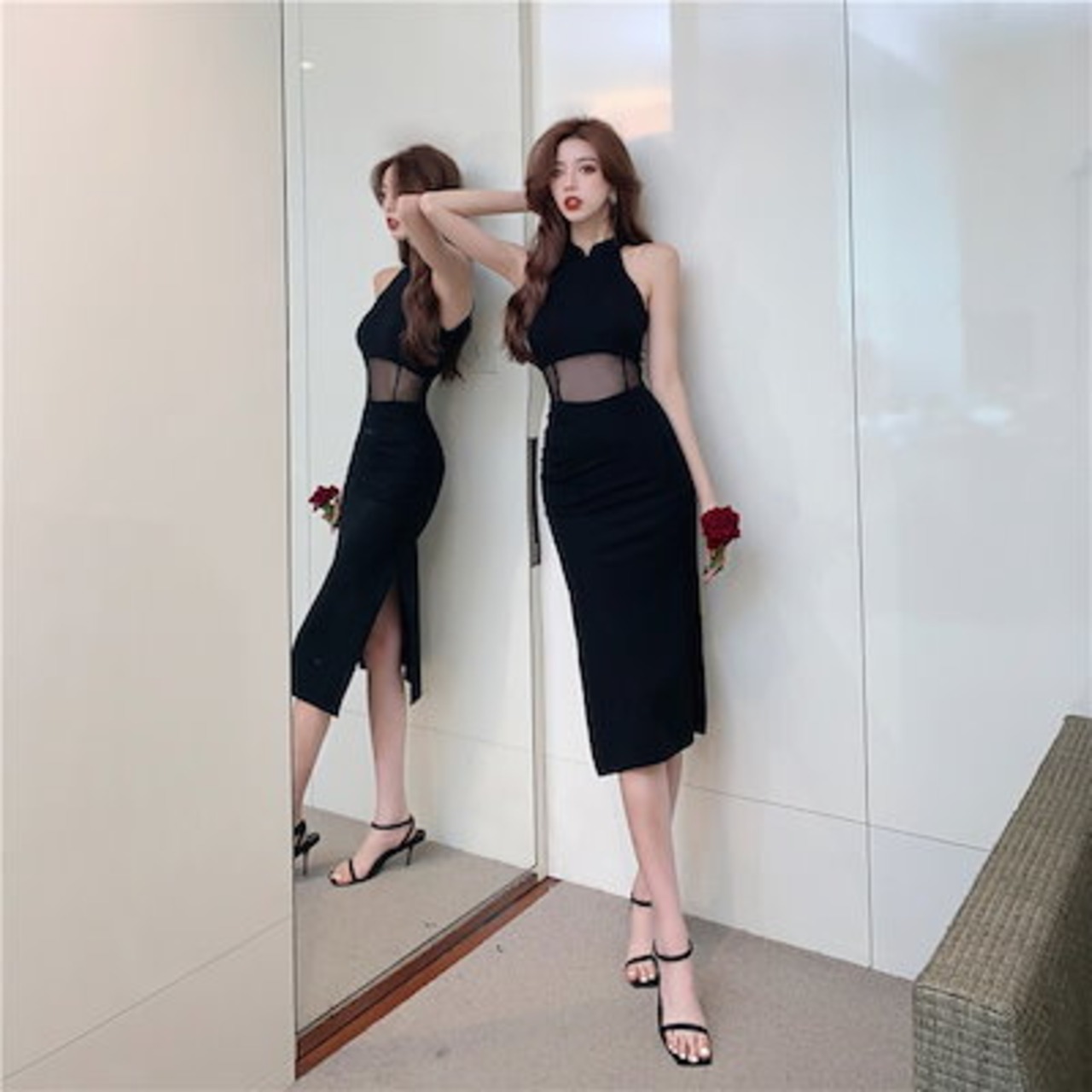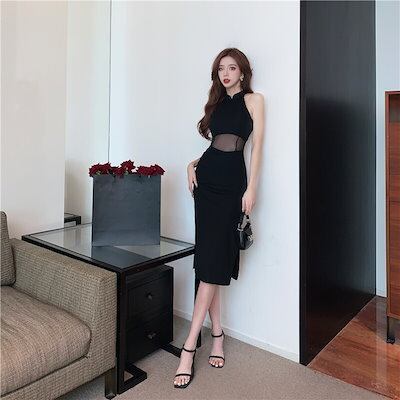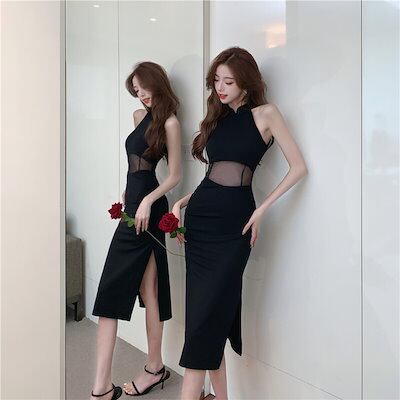 2024夏 韓国スリットメッシュドッキングデザインワンピース韓国