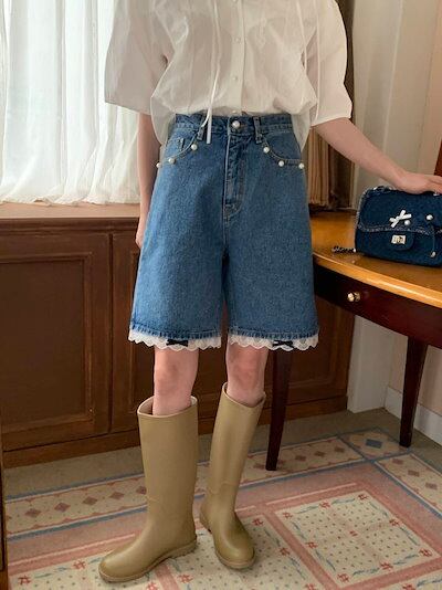 2024 春夏パンツ ハーフパンツ デニム ジーンズ ワイド レース リボン ハイウエスト 美脚効果 脚長効果 細見え 夏 おしゃれ かわいい 韓国ファッション レディース お出かけ