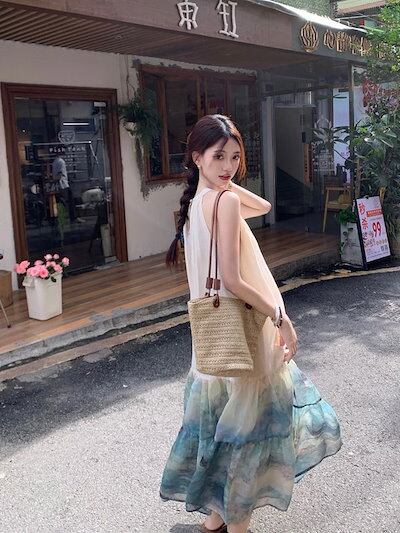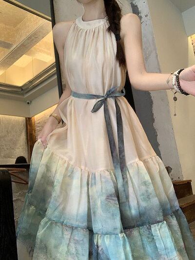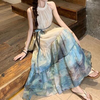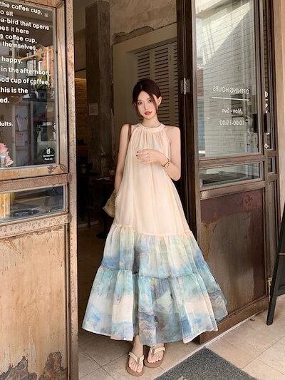 2024夏 韓国ワンピース ドレス ホルターネック ノースリーブ ロング丈 Aライン ゆったり 細見え 夏 青 ブルー きれいめ おしゃれ かわいい 韓国ファッション レディース お出かけ