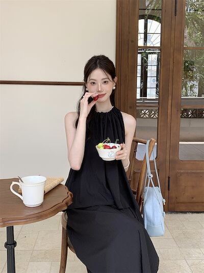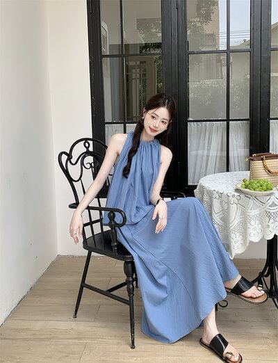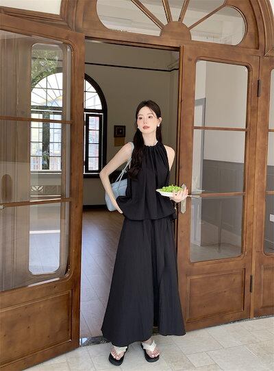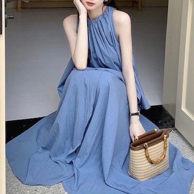 2024夏 韓国セットアップ シャツ ホルターネック ノースリーブ スカート ロング丈 Aライン ゆったり 細見え 夏 青 黒 きれいめ おしゃれ かわいい 韓国ファッション レディース お出かけ
