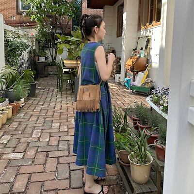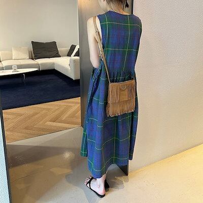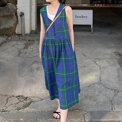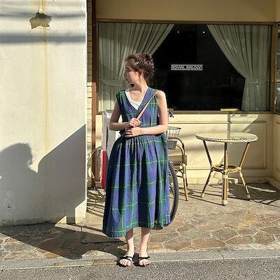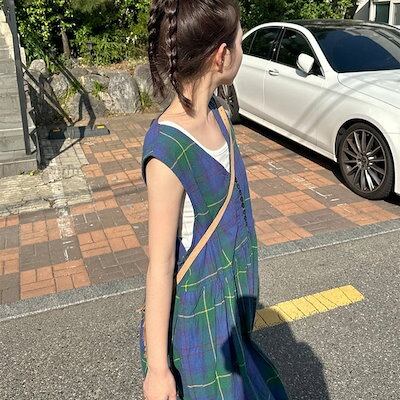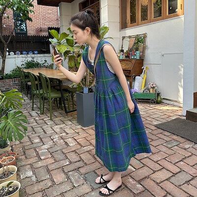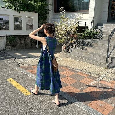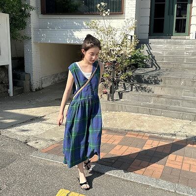 2024夏 韓国セットアップ ジャンパースカート ジャンスカ ミモレ丈 Vネック ノースリーブ Aライン チェック柄 ゆったり 細見え 夏 青 緑 おしゃれ かわいい 韓国ファッション レディース お
