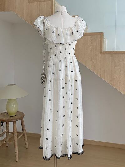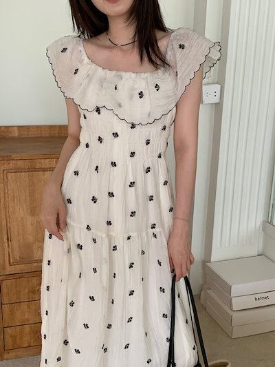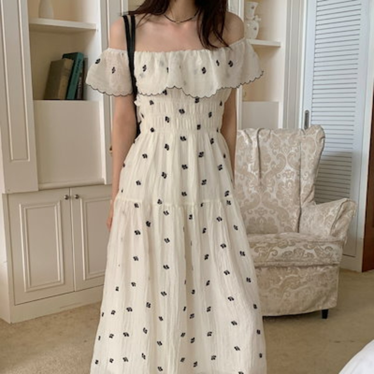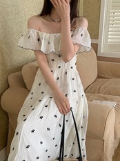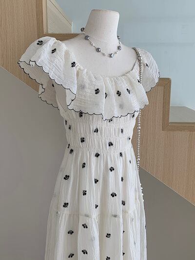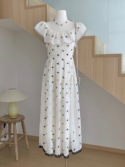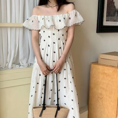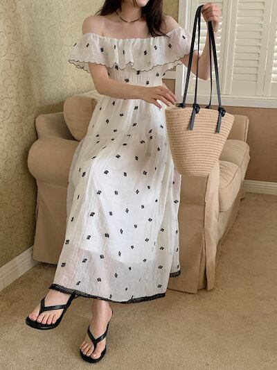 2024春夏ワンピース 半袖 ラウンドネック ミモレ丈 花柄 オフショルダー ゆったり 細見え 夏 白 ホワイト おしゃれ かわいい 韓国ファッション レディース お出かけ