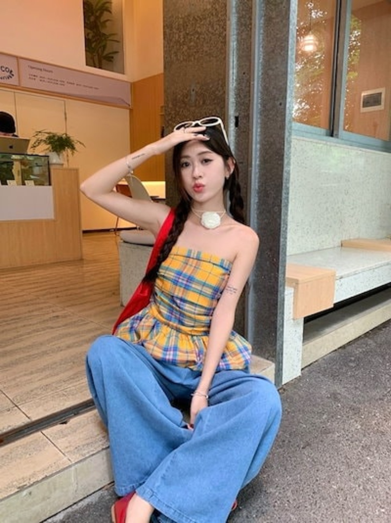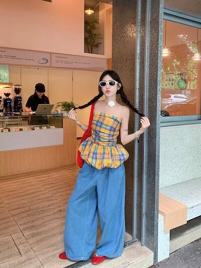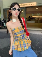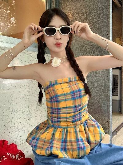 2024夏 韓国トップス シャツ チェック ノースリーブ スリム 細見え 夏 黄色 イエロー カジュアル おしゃれ かわいい 韓国ファッション レディース お出かけ