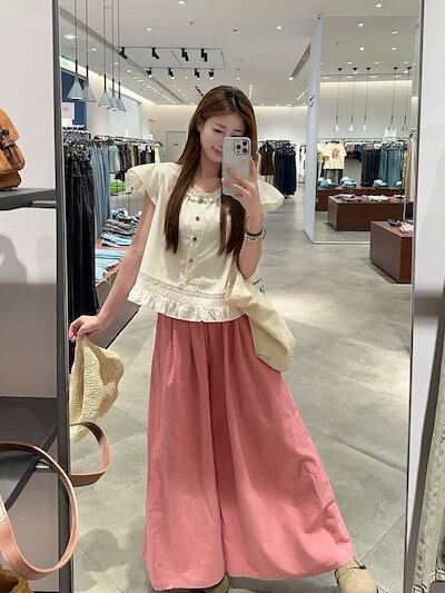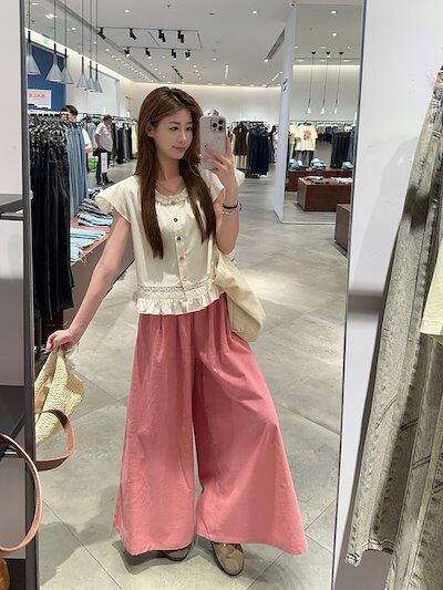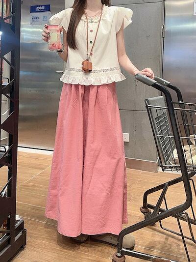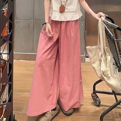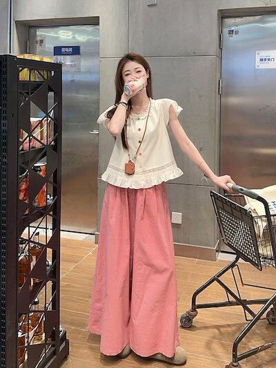 2024 春夏パンツ ロング丈 ワイド フレア ハイウエスト 美脚効果 脚長効果 細見え 夏 ピンク ガーリー キュート おしゃれ かわいい 韓国ファッション レディース お出かけ