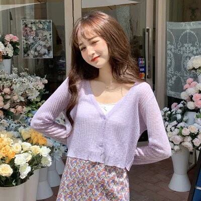 2024 春夏 ショート丈 薄手 カーディガン トップス 長袖 紫外線対策 UVカット冷房羽織り加工 きれいめ ライトニット オフィス OLネックカジュアルフレンチフェミニンファッション韓国レディース