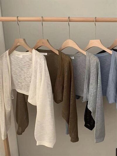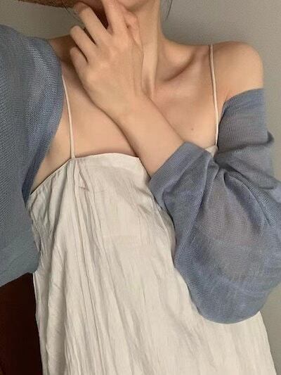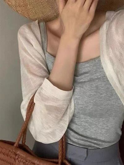 2024 夏 韓国 ショート丈 薄手 カーディガン トップス 長袖 紫外線対策 UVカット冷房羽織り加工 きれいめ ライトニット オフィス OLネックカジュアルフレンチフェミニンファッション韓国レディ