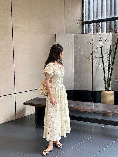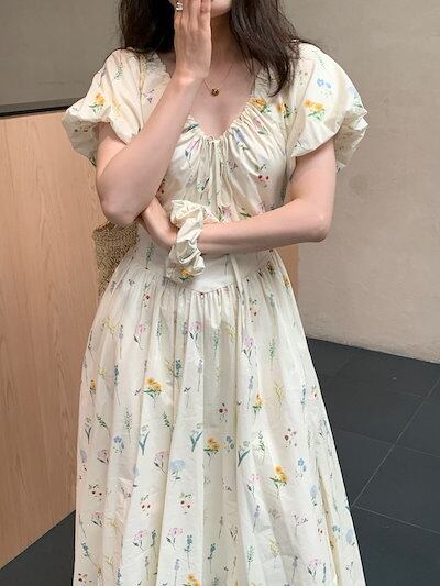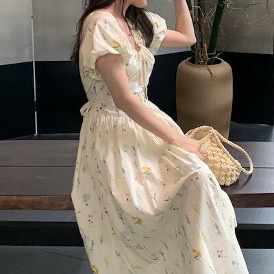 2024春夏ワンピース ロング丈 Vネック 半袖 バブル袖 花柄 Aライン リボン ゆったり 細見え 夏 カジュアル おしゃれ かわいい キュート 韓国ファッション レディース お出かけ