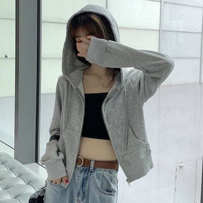 パーカーレディースジップジャケット2025秋作ゆったりフード付きショート長袖薄カーディガンスウェット韓国