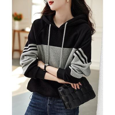 2024作スウェットパ力秋冬でパーカーレディース色切り替え長袖フード付きスウェットカジュアル百掛けトップスtシャツ韓国ファッション怠惰秋アウター