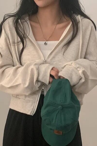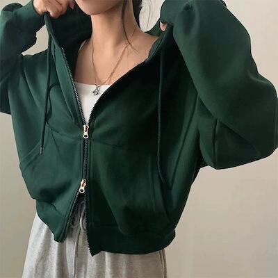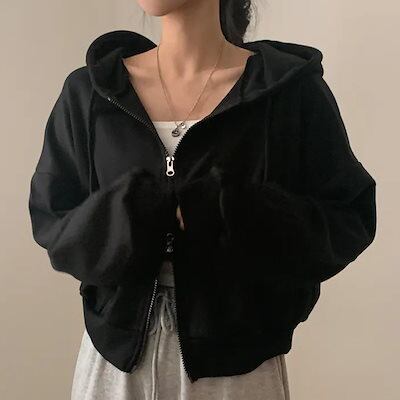 韓国ファッション 長袖パーカー レディース カップル初秋ニッチヴィンテージフード付きダブルジップデザインルーズカジュアル多用途長袖ショートスウェットシャツ