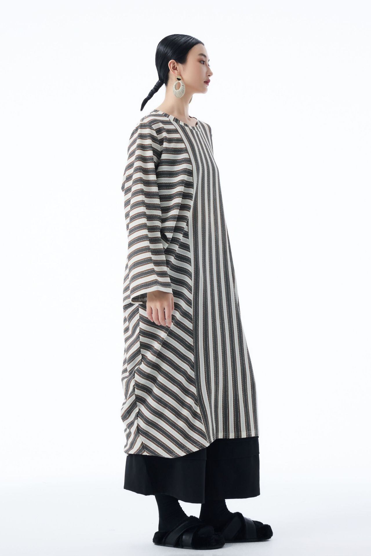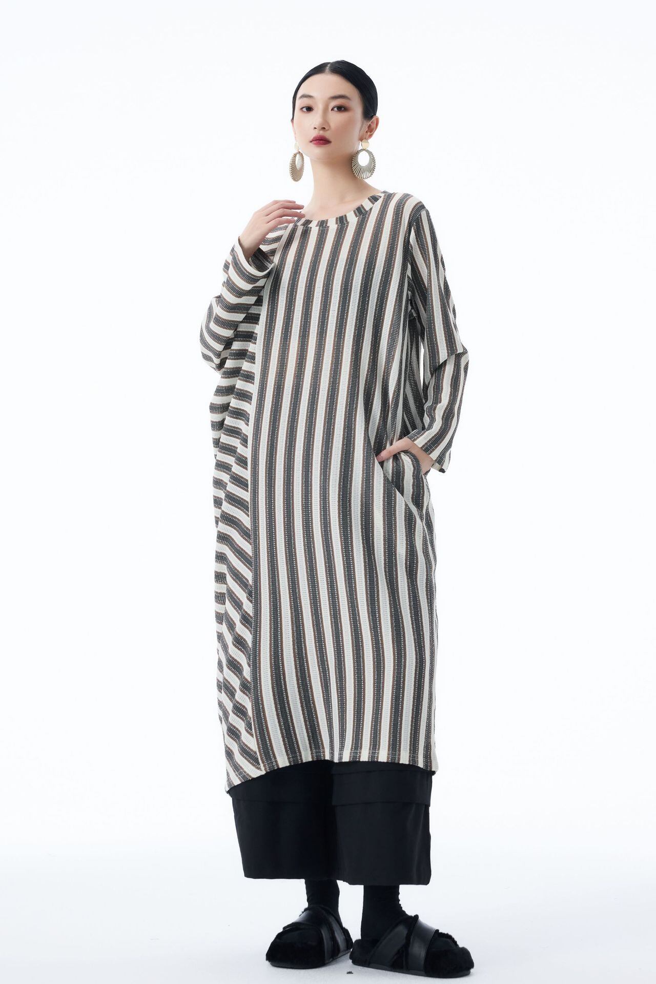 u28702トップス レディース ロングワンピース ボーダー ラウンドネック 長袖 レトロ 2025夏秋新作