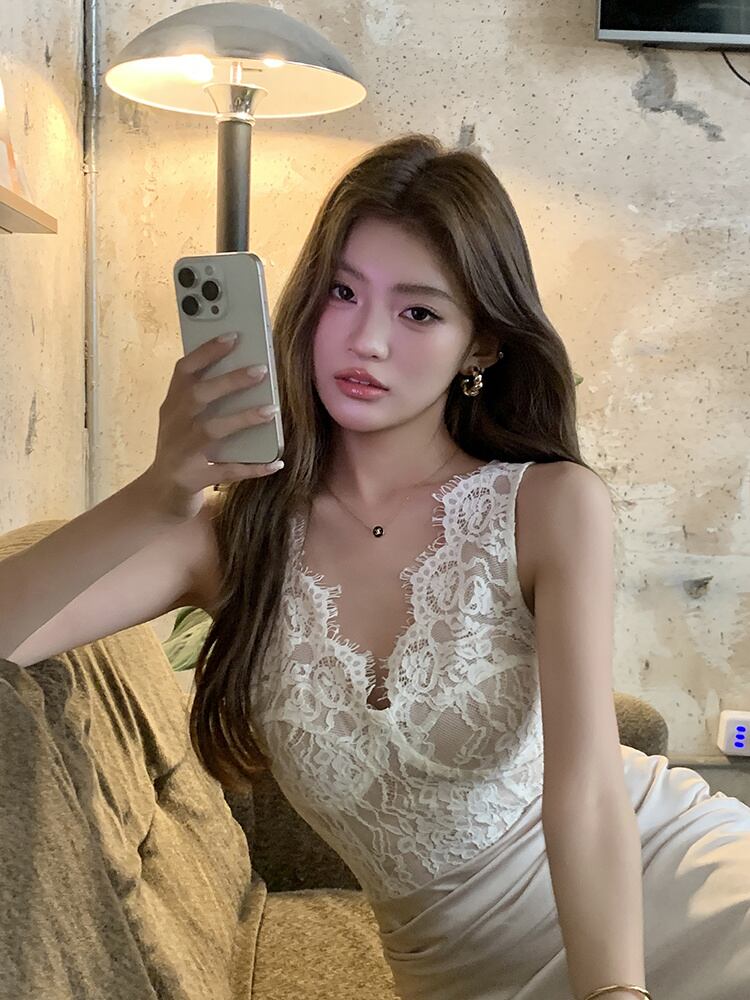 2025春夏新作 Vネックレース刺繍 サテンドレス ノースリーブ シェイプアップフィット