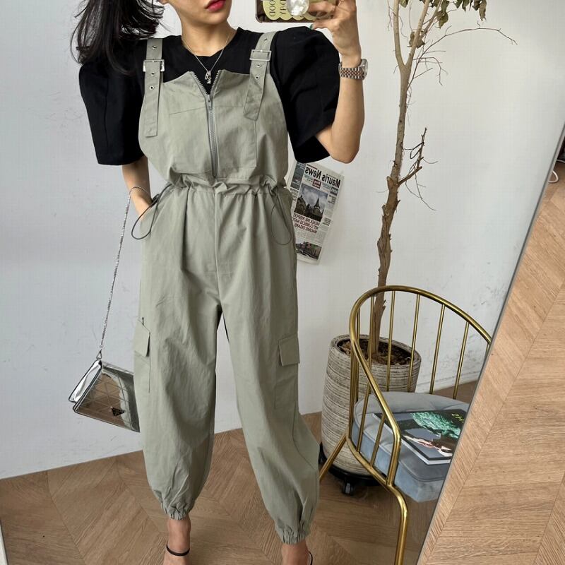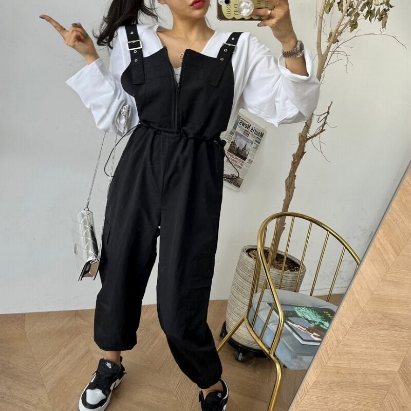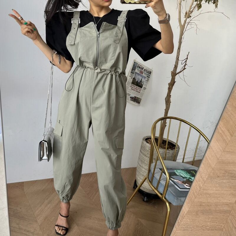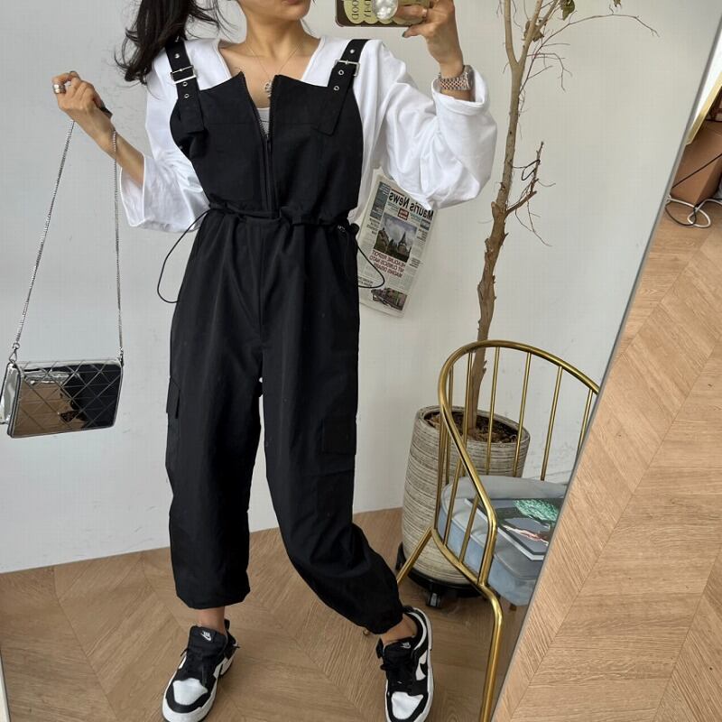 全2色 オールインワン オーバーオール 切り替え スリム 着痩せ ノースリーブ シンプル