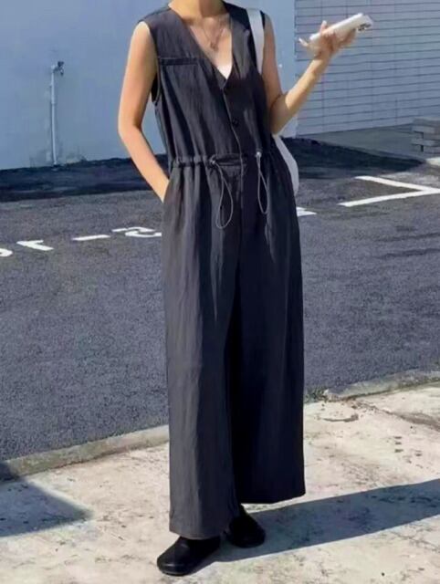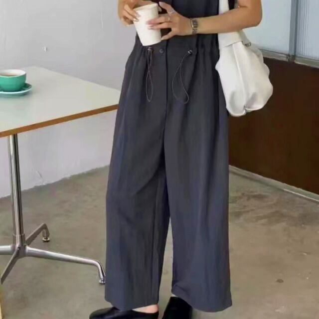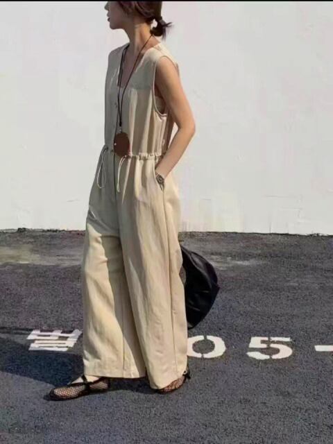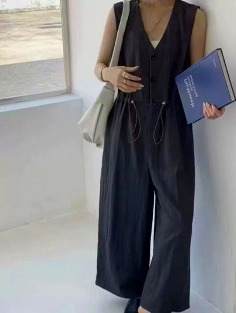 全2色 オールインワン オーバーオール ノースリーブ 切り替え 体型カバー 着痩せ カジュアル