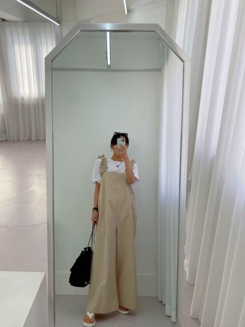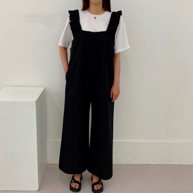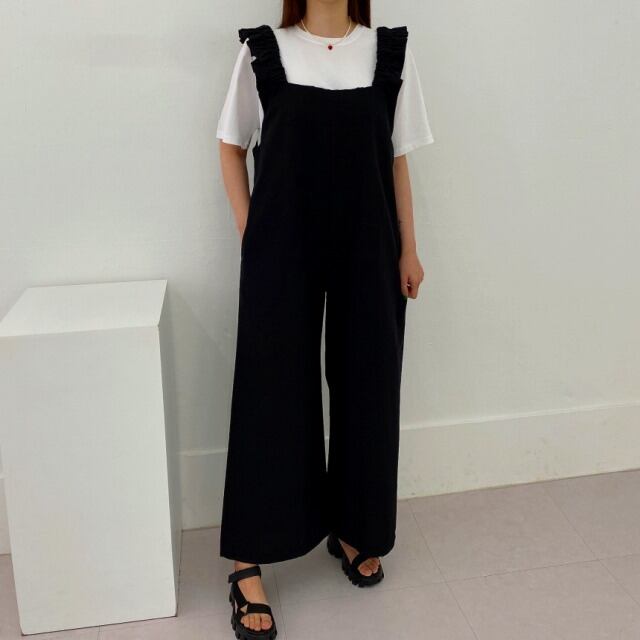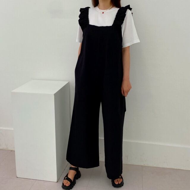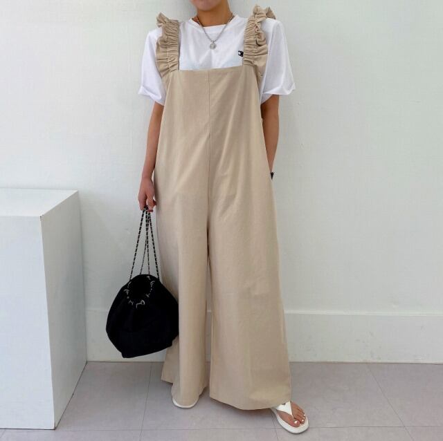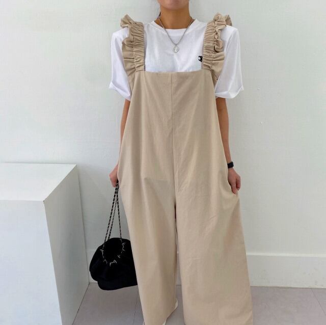 全2色 オールインワン オーバーオール ノースリーブ フリル 切り替え 体型カバー 着痩せ カジュアル
