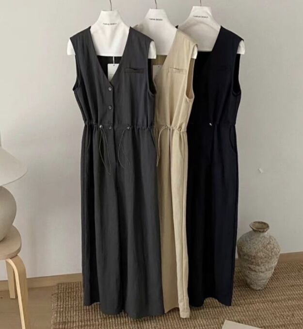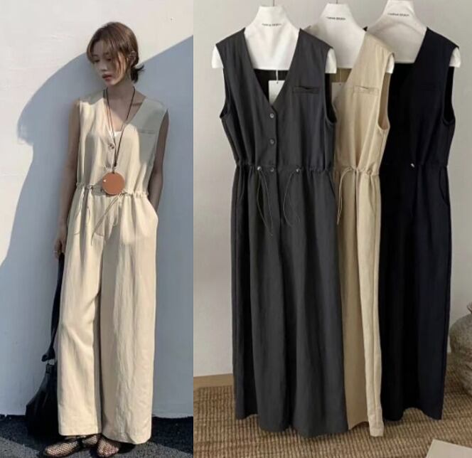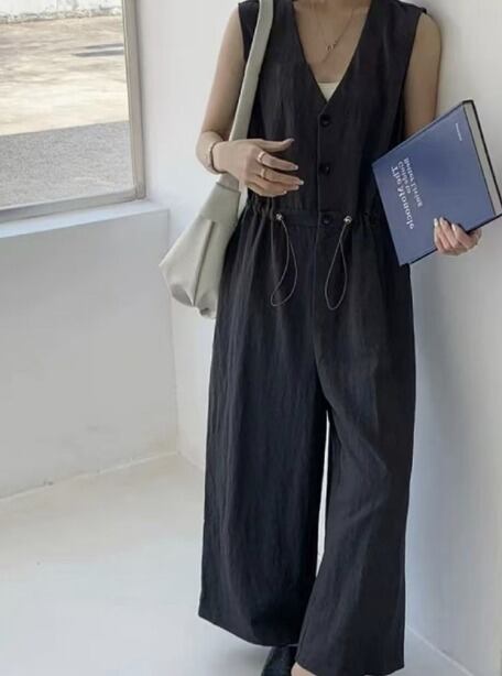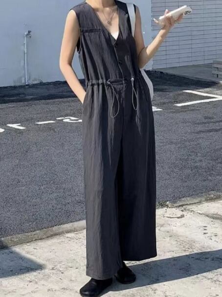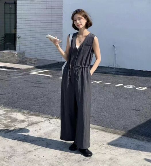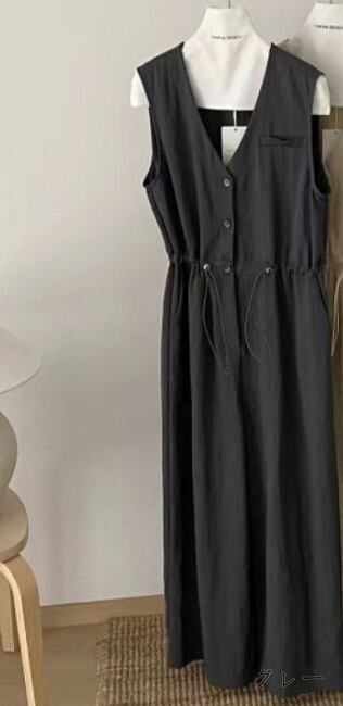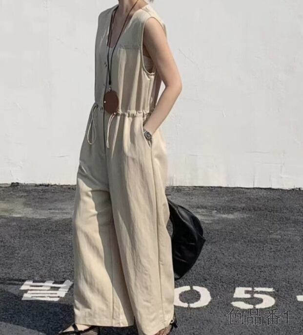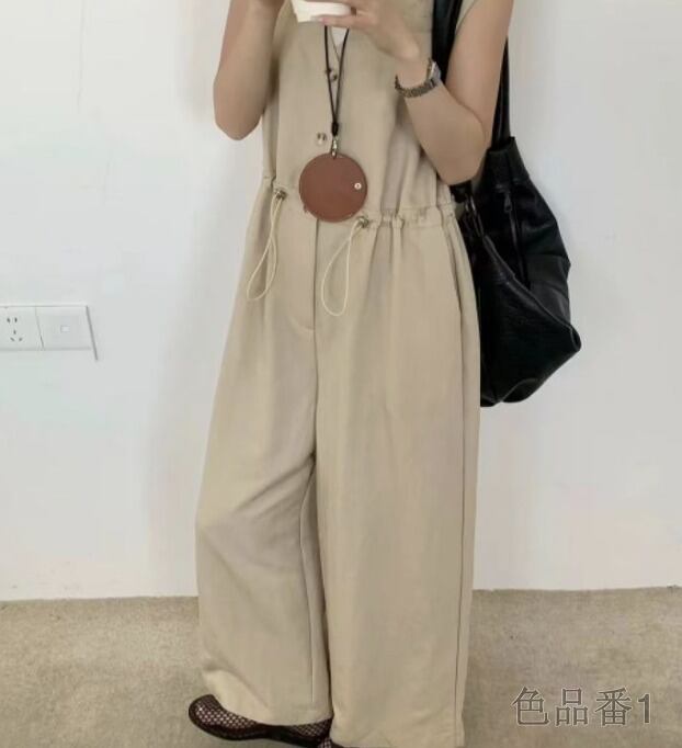全3色 オールインワン オーバーオール ノースリーブ 切り替え 体型カバー 着痩せ カジュアル