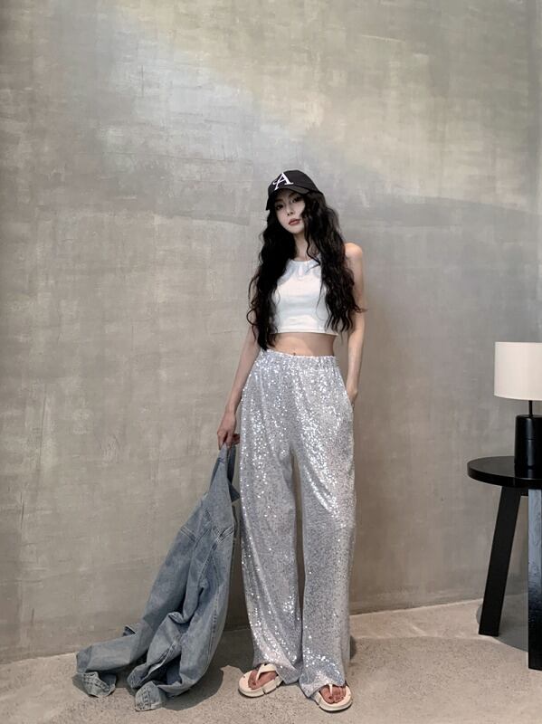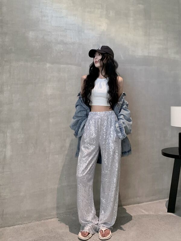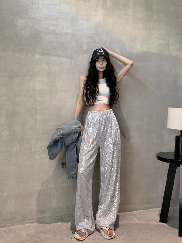 ワイド バギーパンツ 切り替え 体型カバー 着痩せ スパンコール シンプル カジュアル