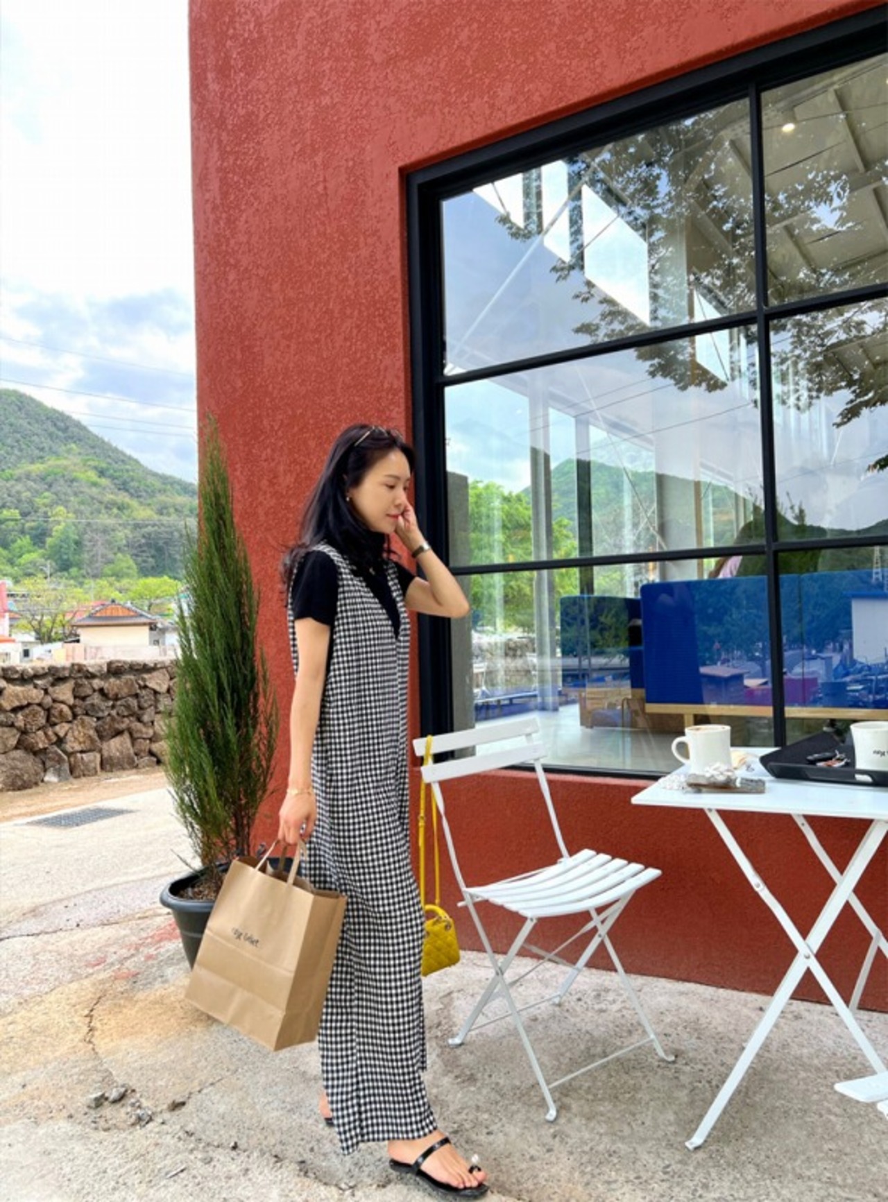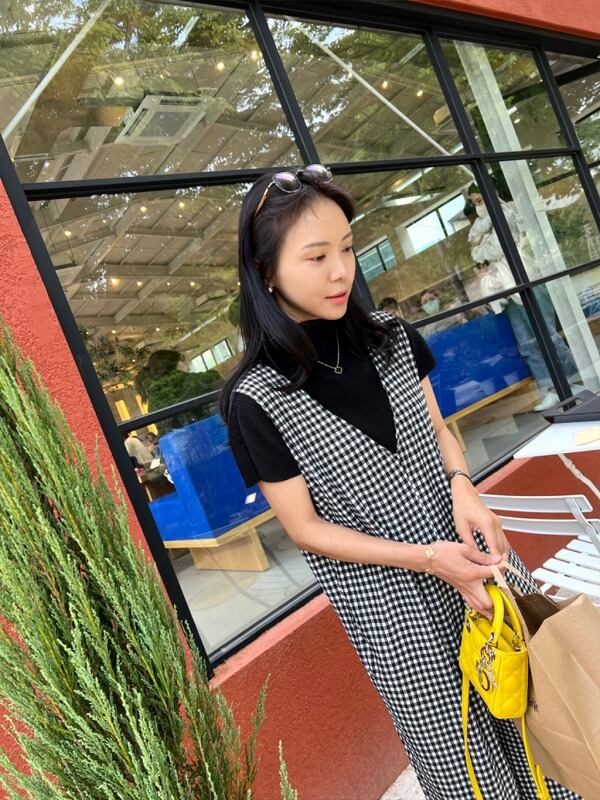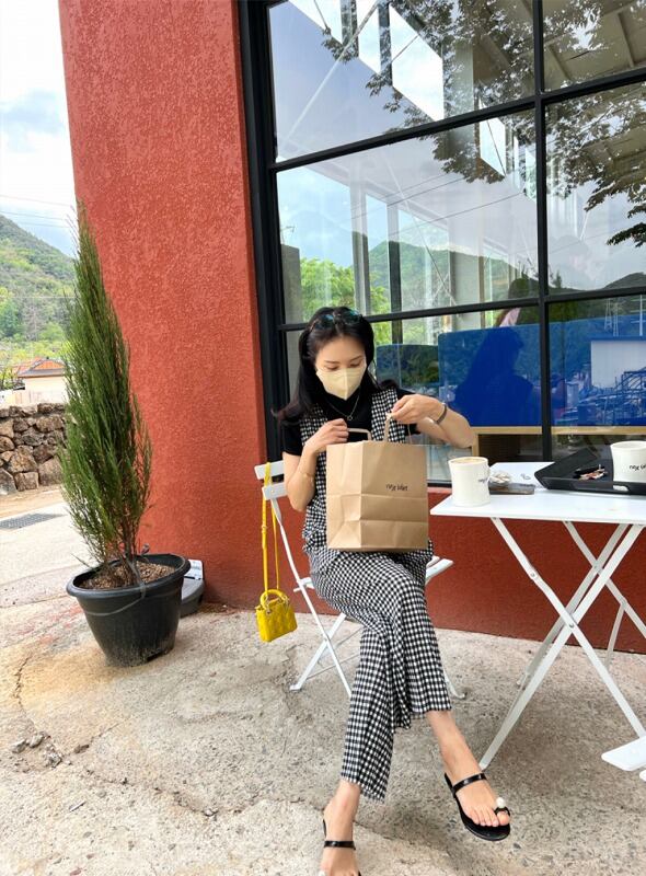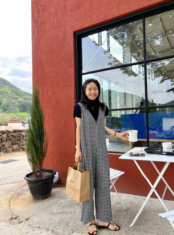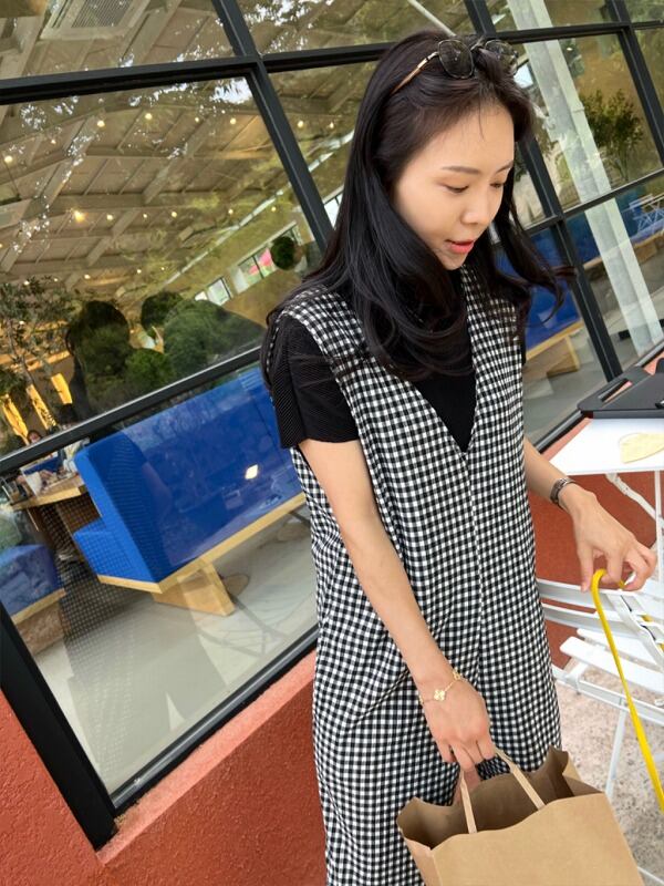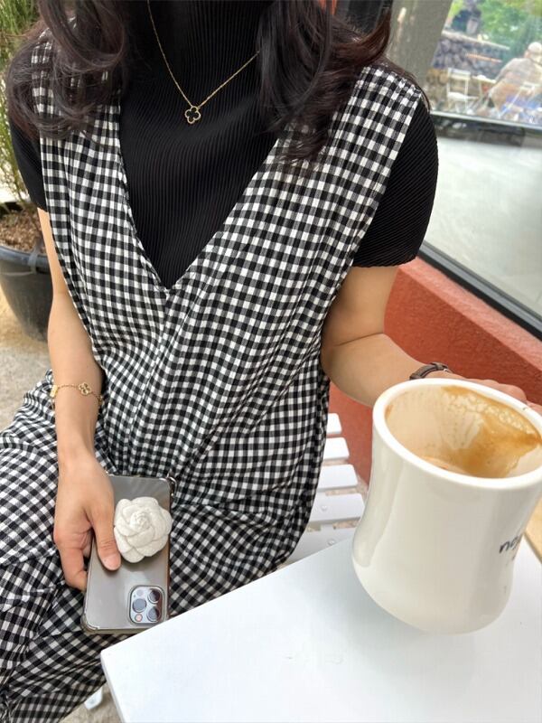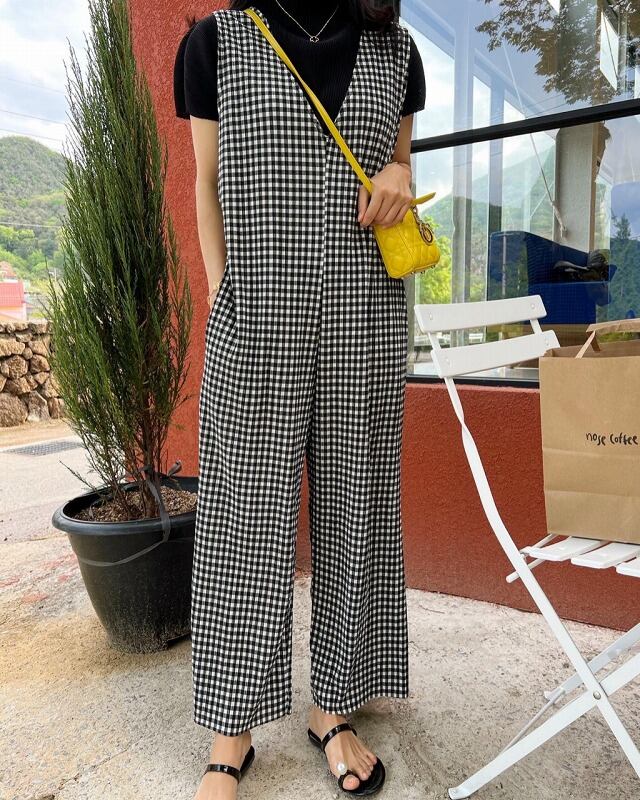 オールインワン オーバーオール ノースリーブ 切り替え バイカラー 体型カバー 着痩せ チェック柄 シンプル