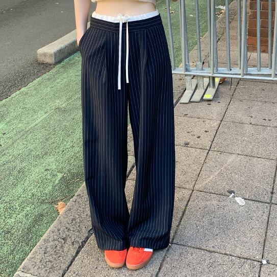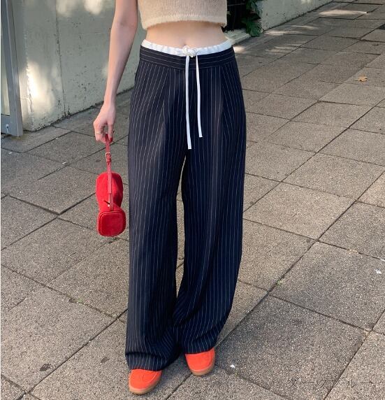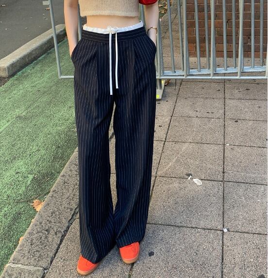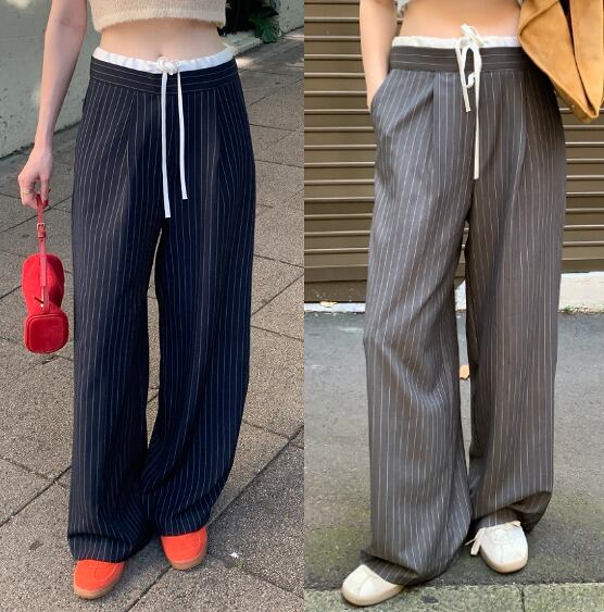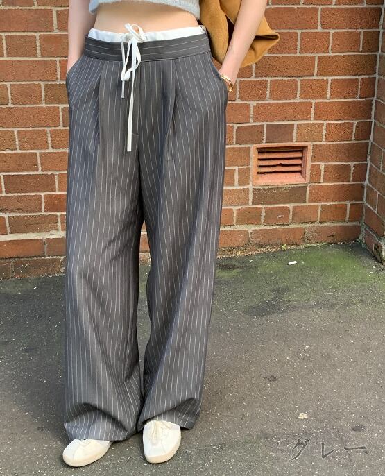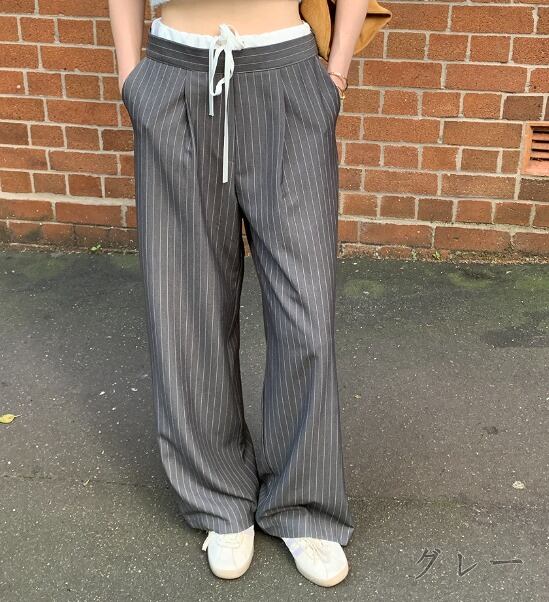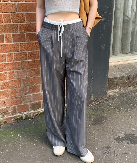 全2色 パンツ 切り替え バイカラー 体型カバー 着痩せ ストライプ柄 カジュアル