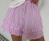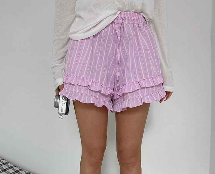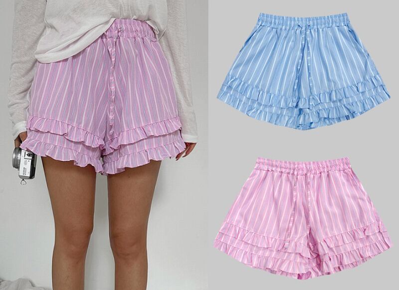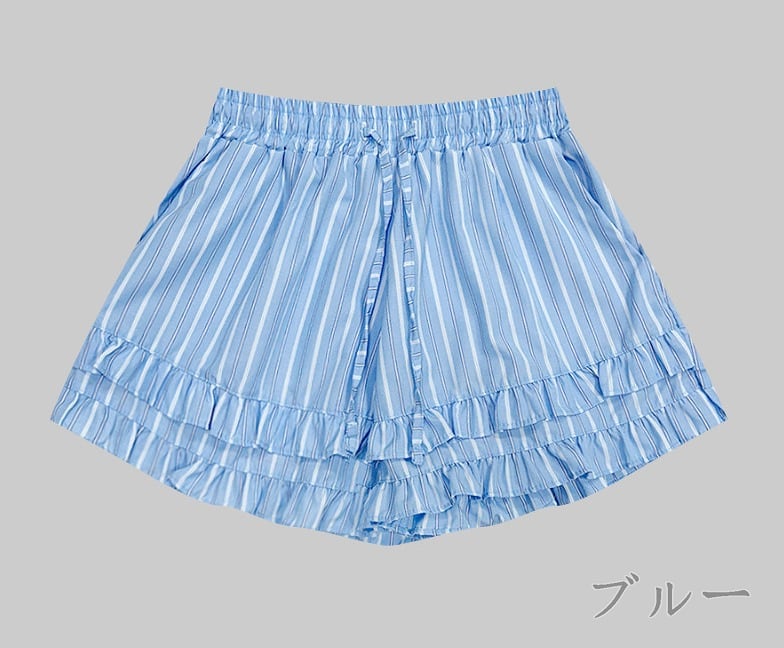 全2色 ショートパンツ ショーパン フリル 切り替え バイカラー 体型カバー 着痩せ ストライプ柄 カジュアル