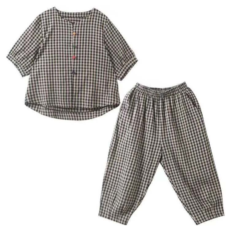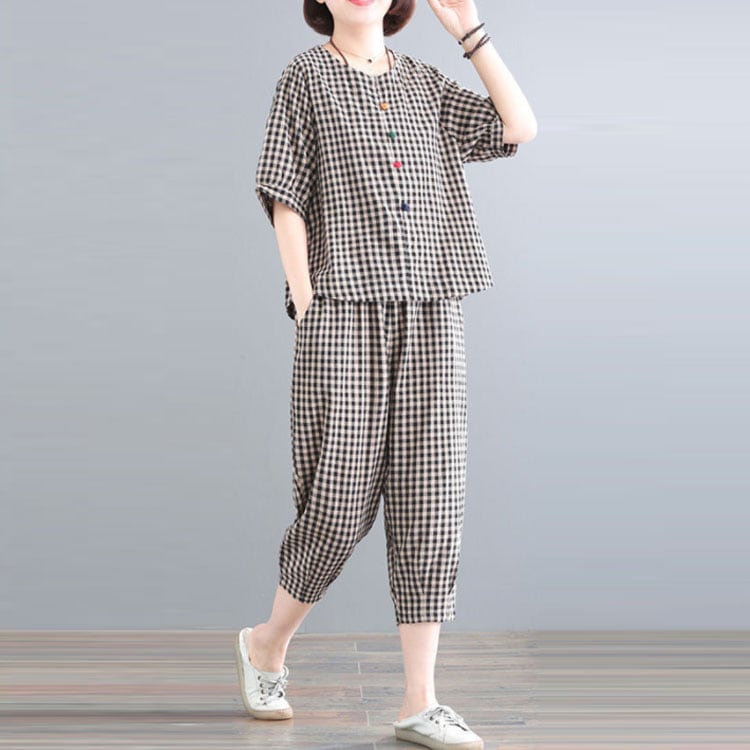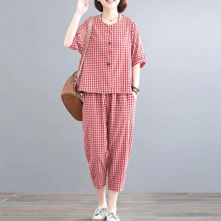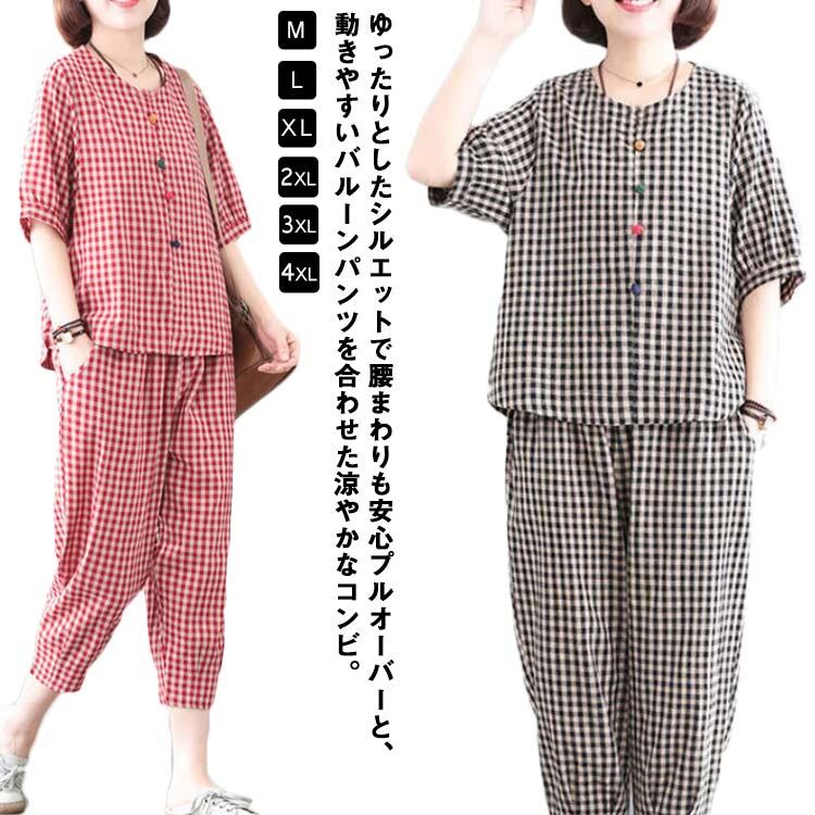 【送料無料】レディース セットアップ チェック柄 ブラウス 長ズボン プルオーバー 丸首