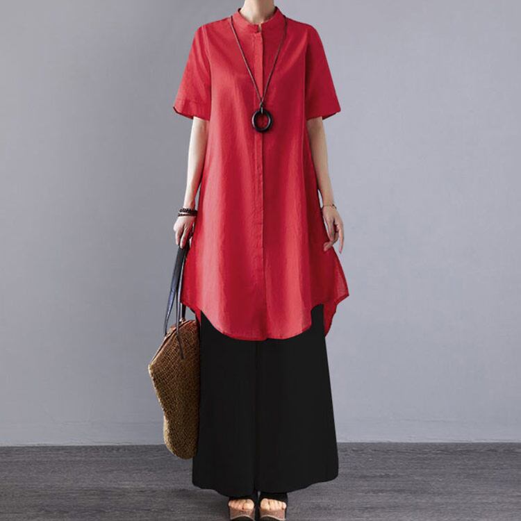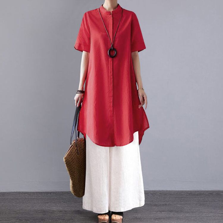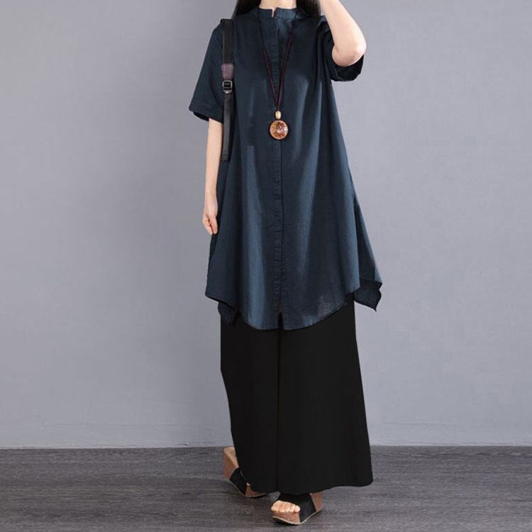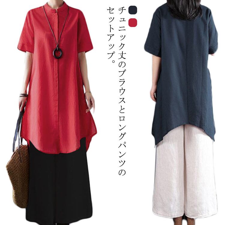 【送料無料】ブラウス チュニック 長ズボン セットアップ 綿麻混 バンドカラー ロングシャ