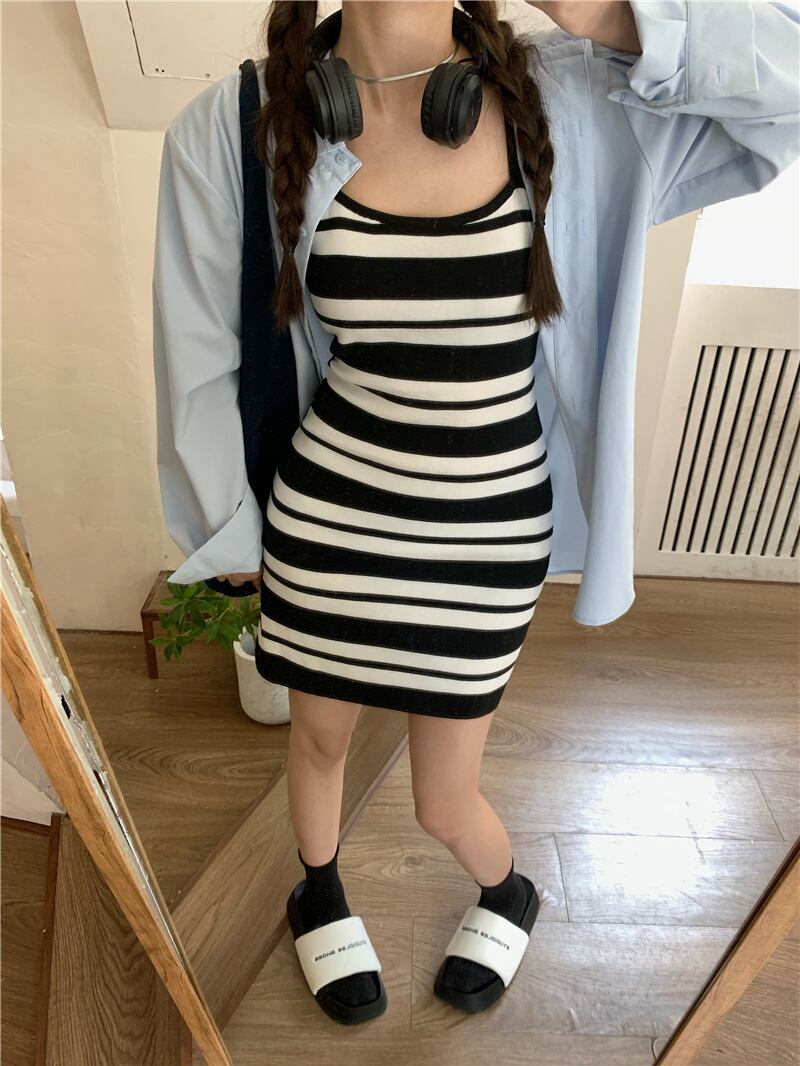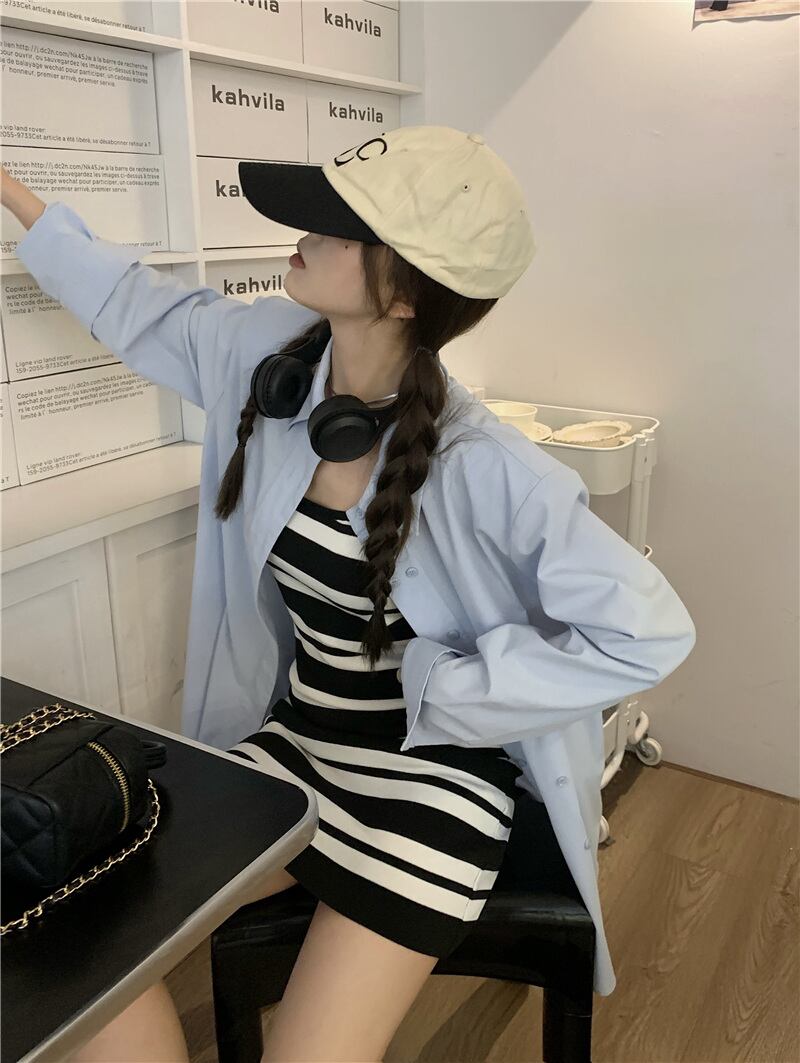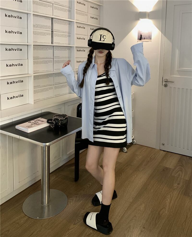2023夏INS新作★気質ストライプ柄 ベアトップ キャミソール ワンピース +シャツコート セット 韓国風