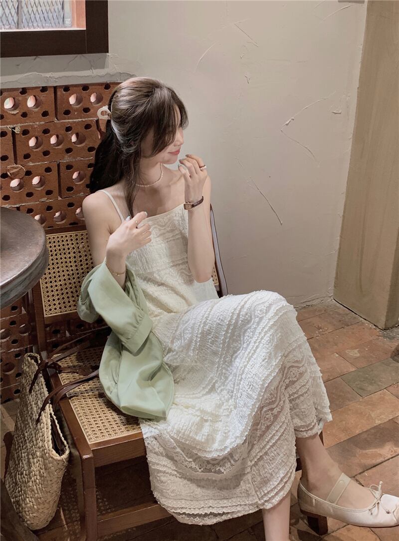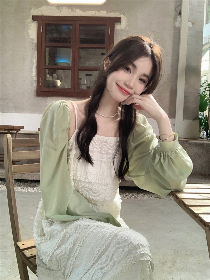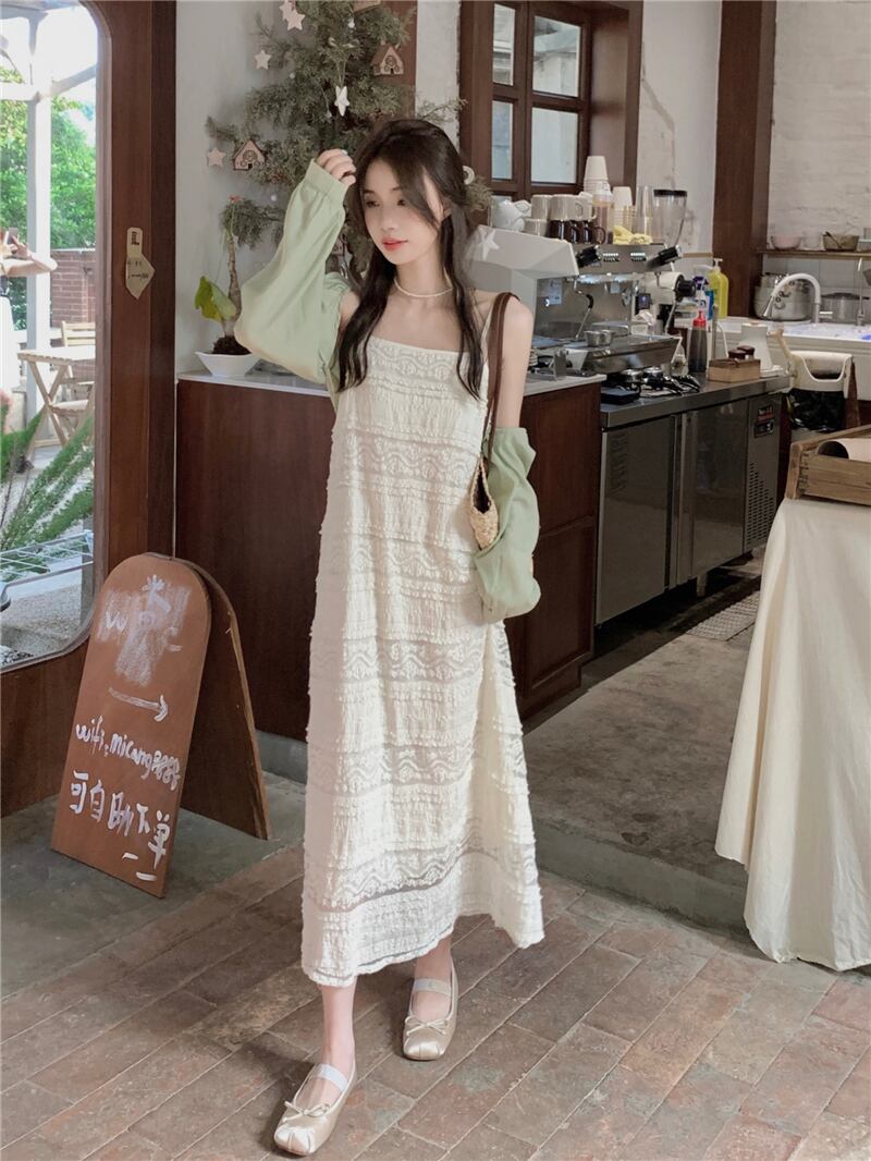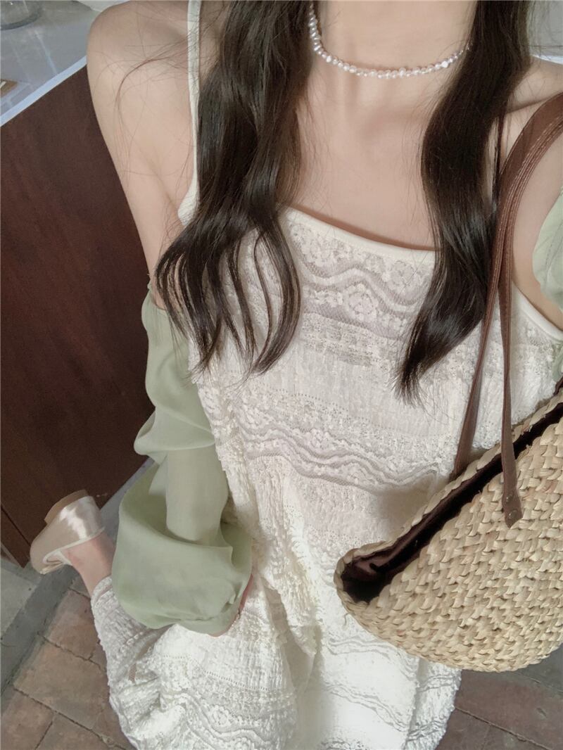 2023夏INS新作★気質 ベアトップ キャミソール ワンピース+透かしブラウス セット 韓国風 スカート