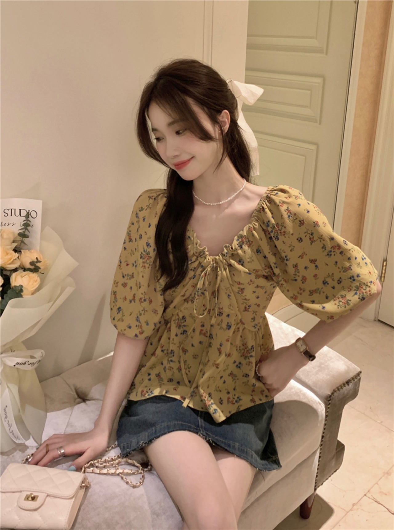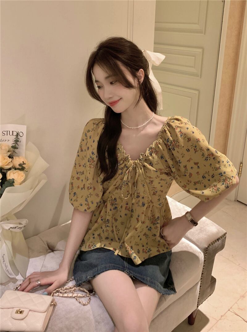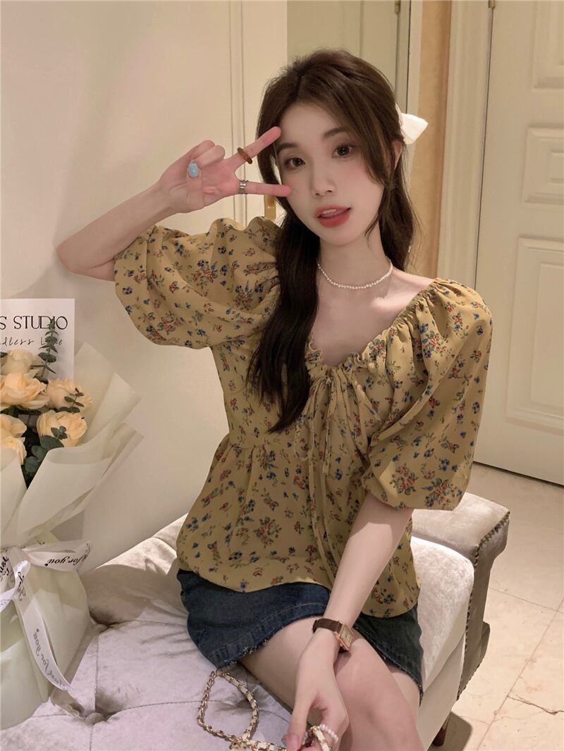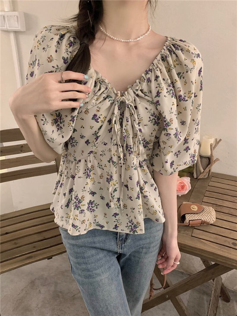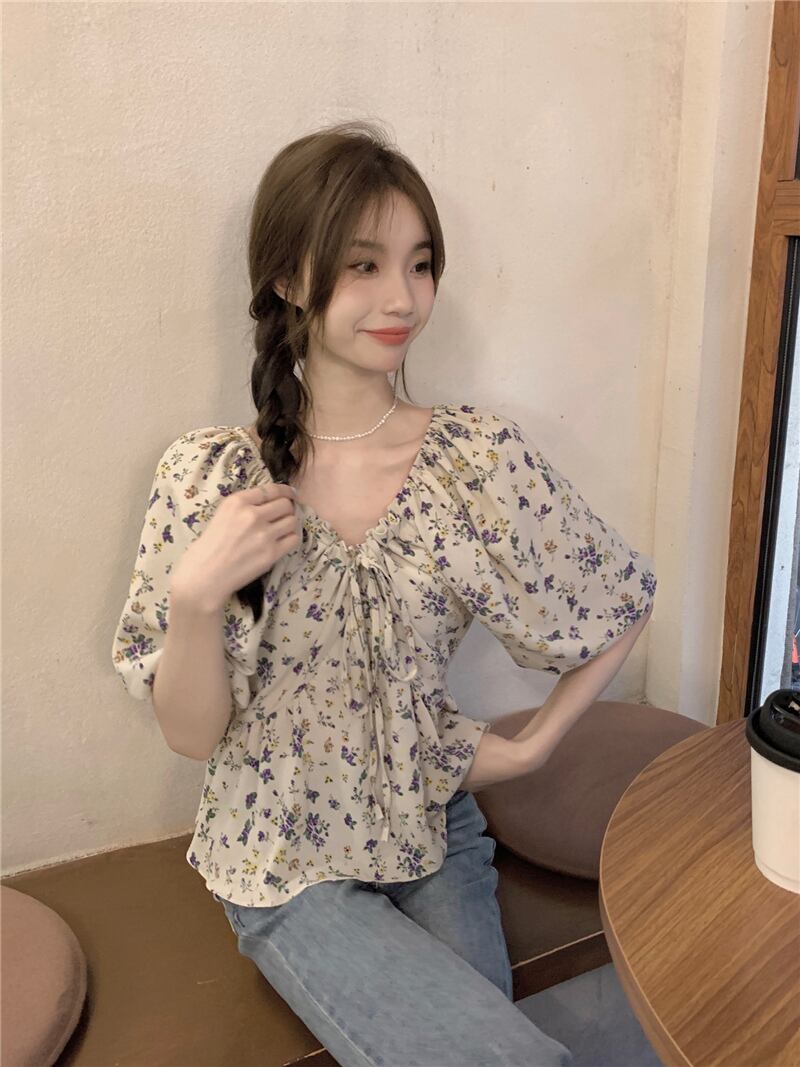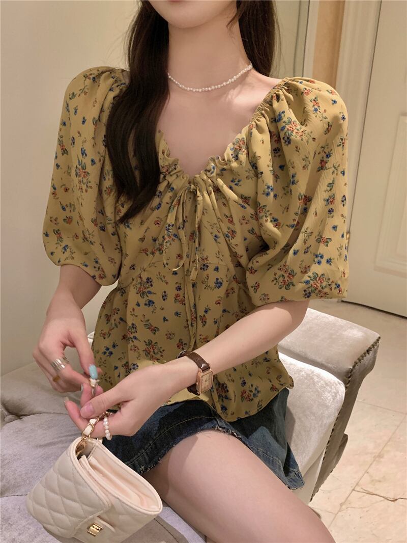 2023夏INS新作★超気質 優しい 着痩せ レトロ 花柄 Vネック シャツ トップス