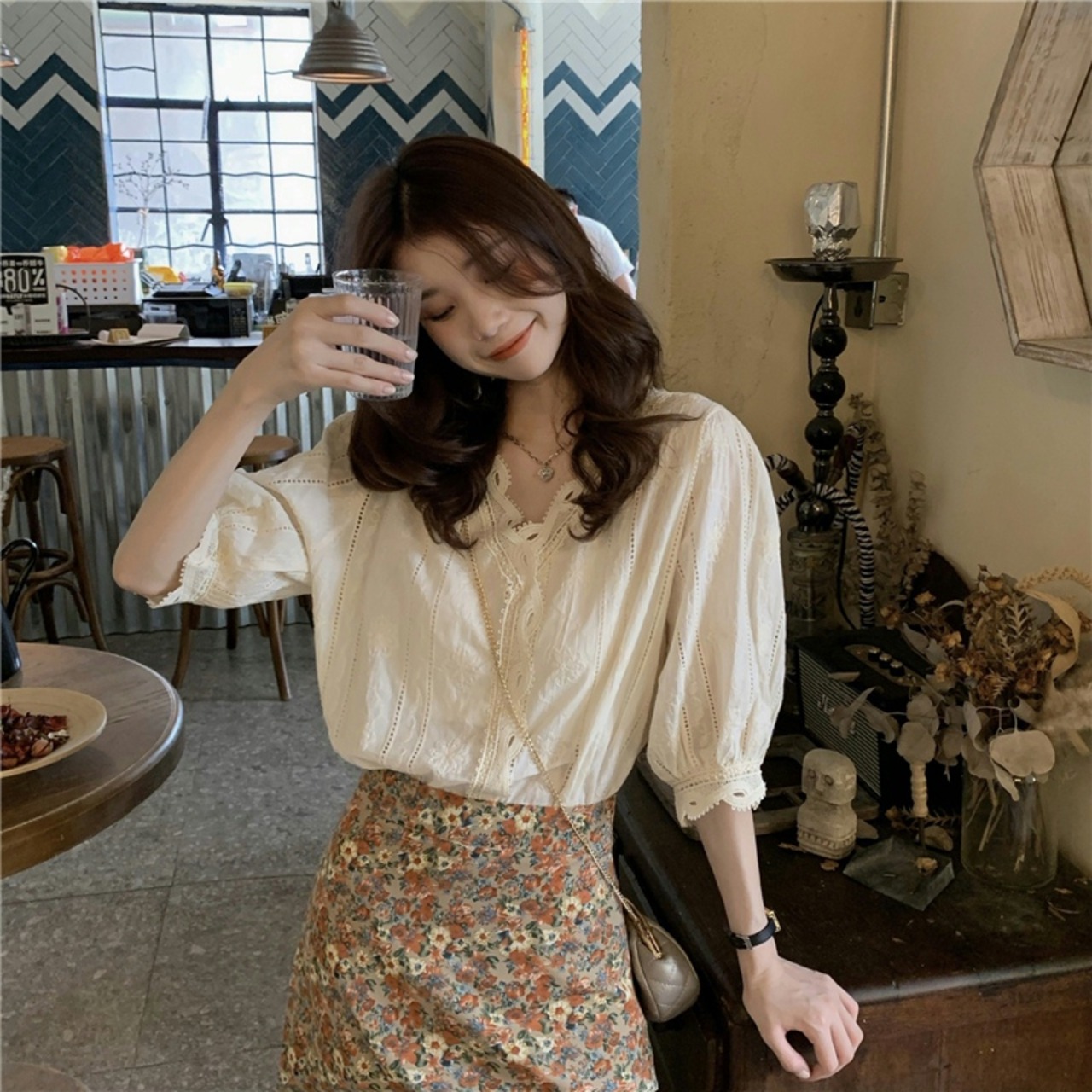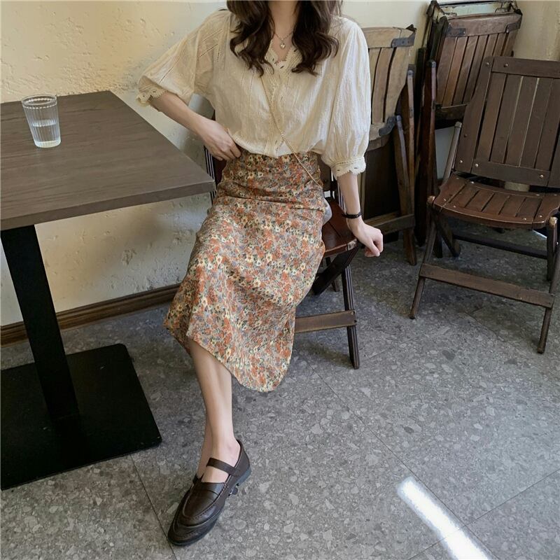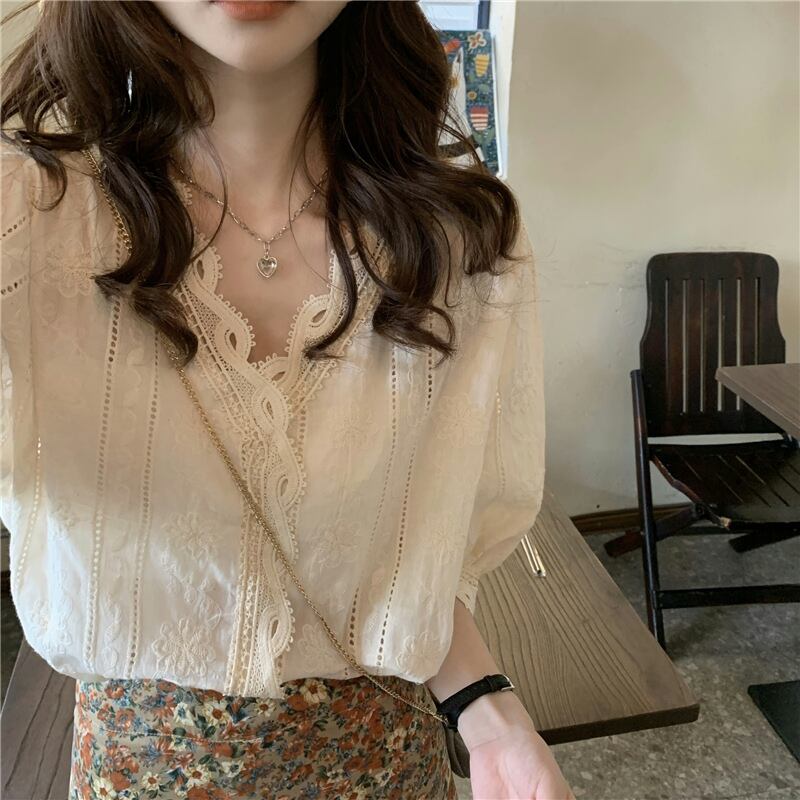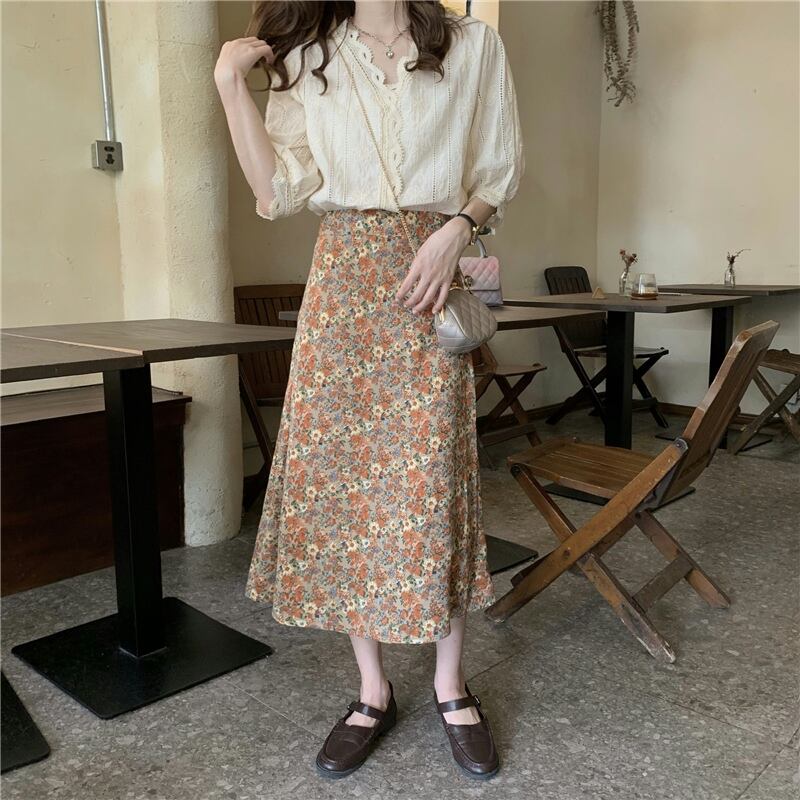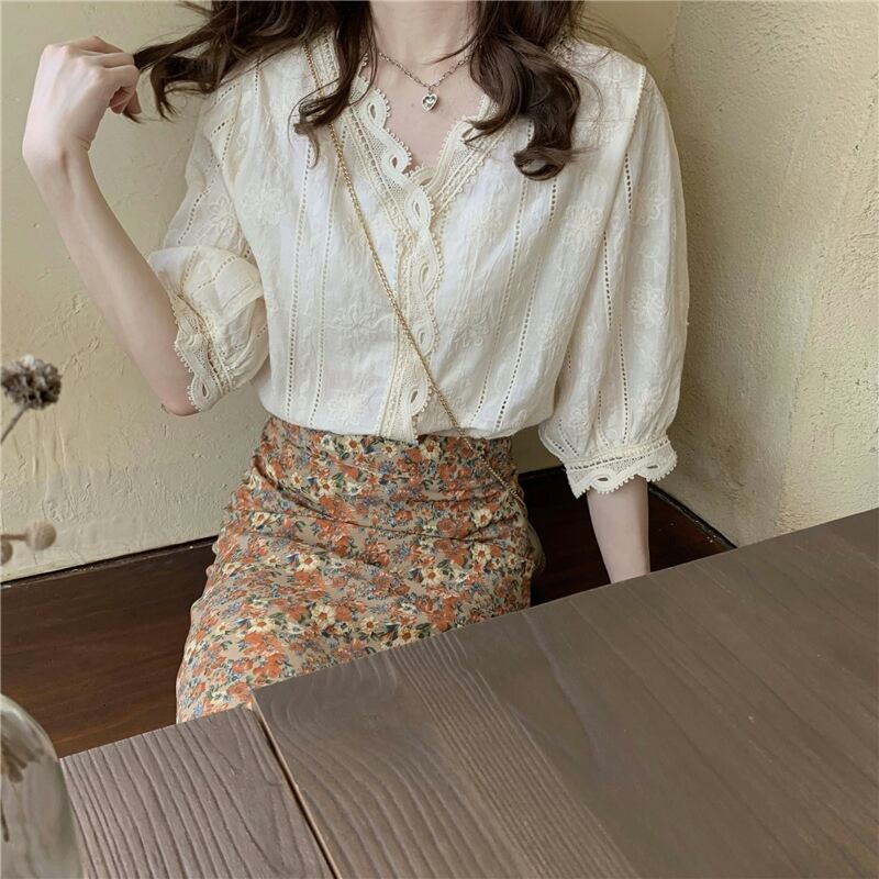 2023夏INS新作★エレガント系 Vネック レース飾り シャツ+セミロングスカート 韓国系