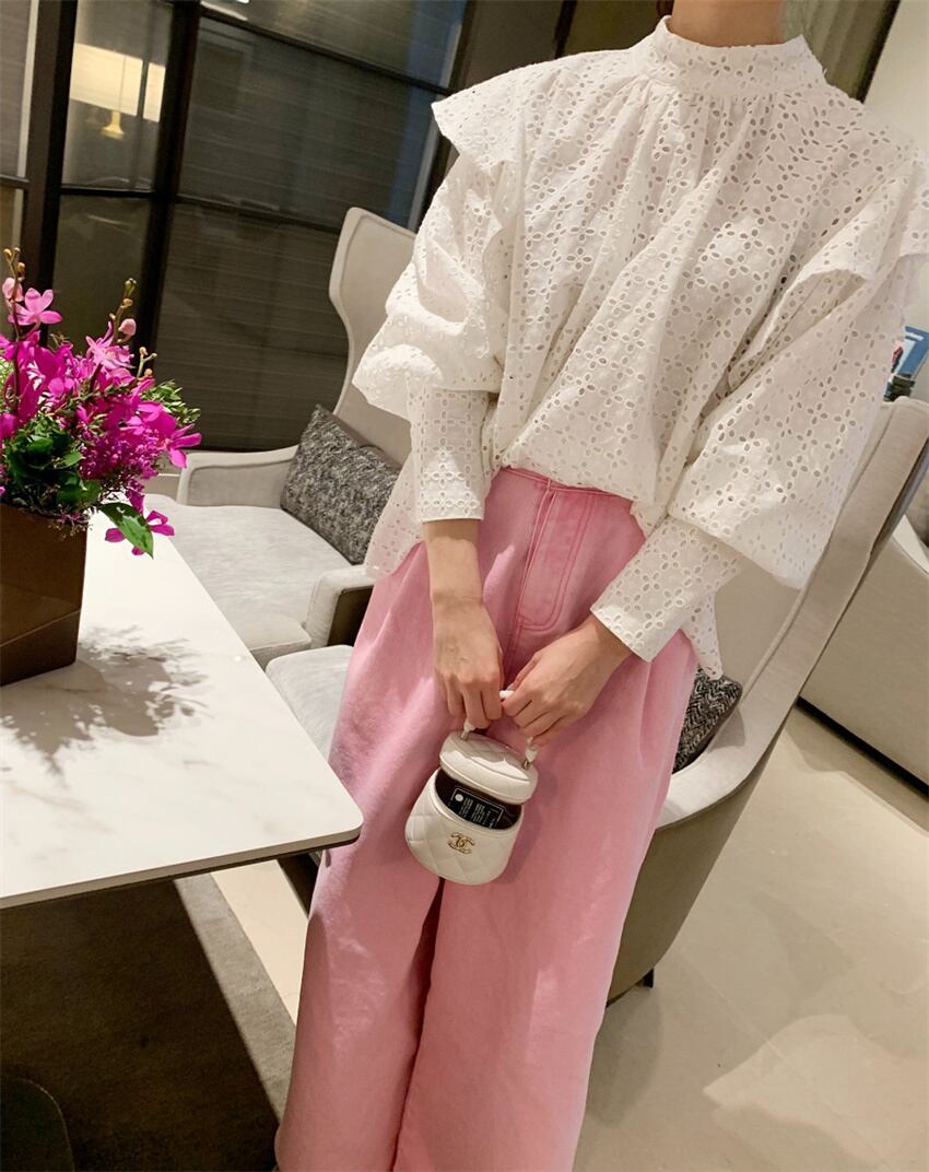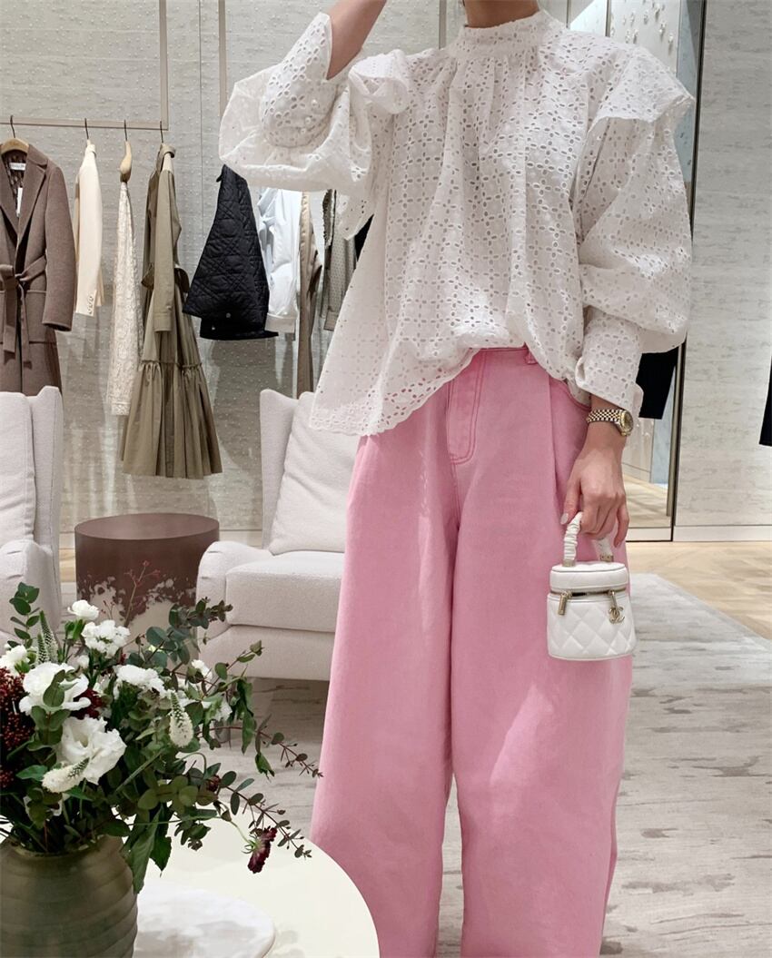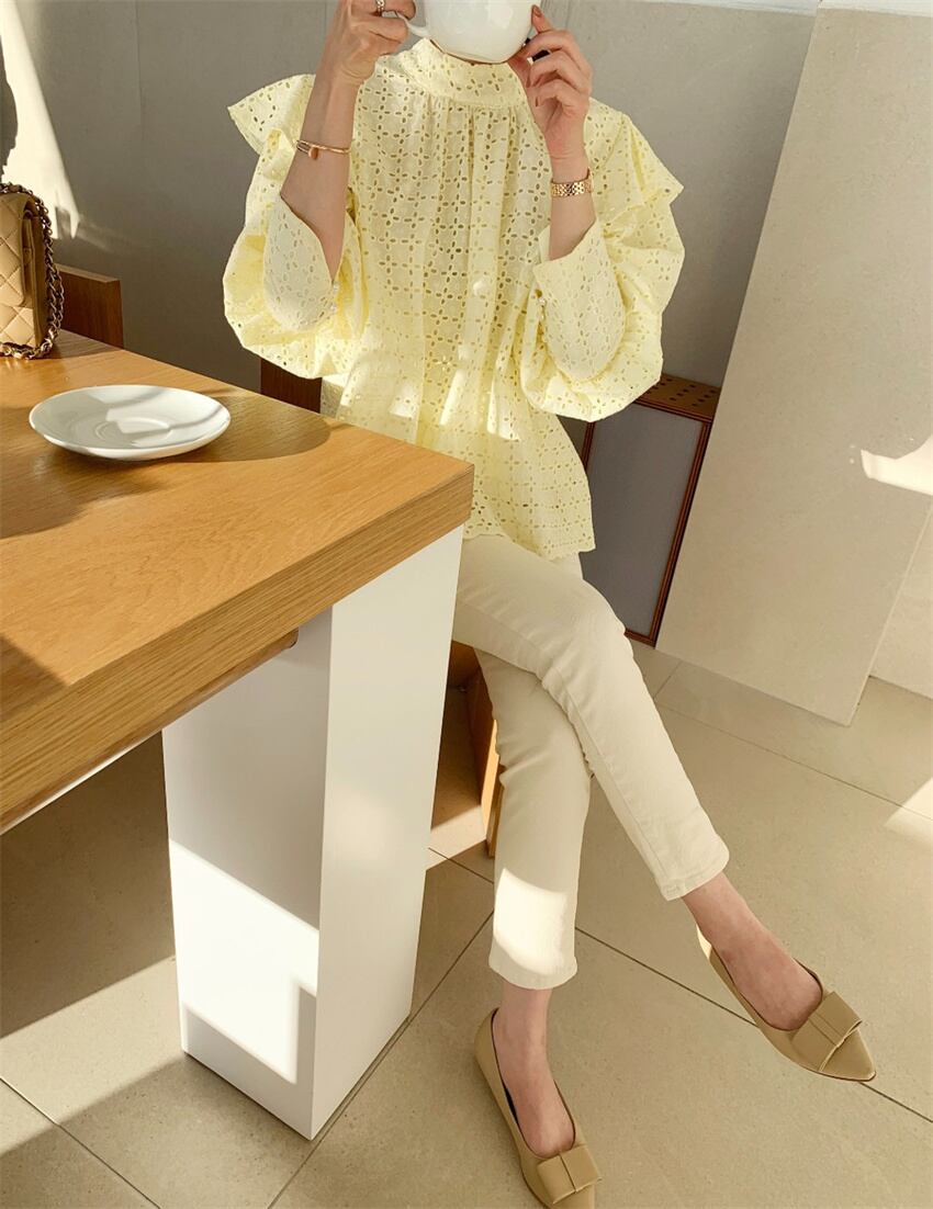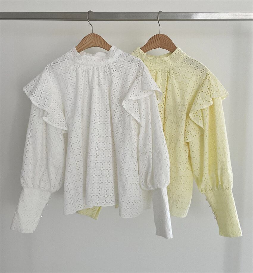 2023春INS★レイジー風 デザイン感 パフスリーブ 透かし彫り シャツ/ブラウス