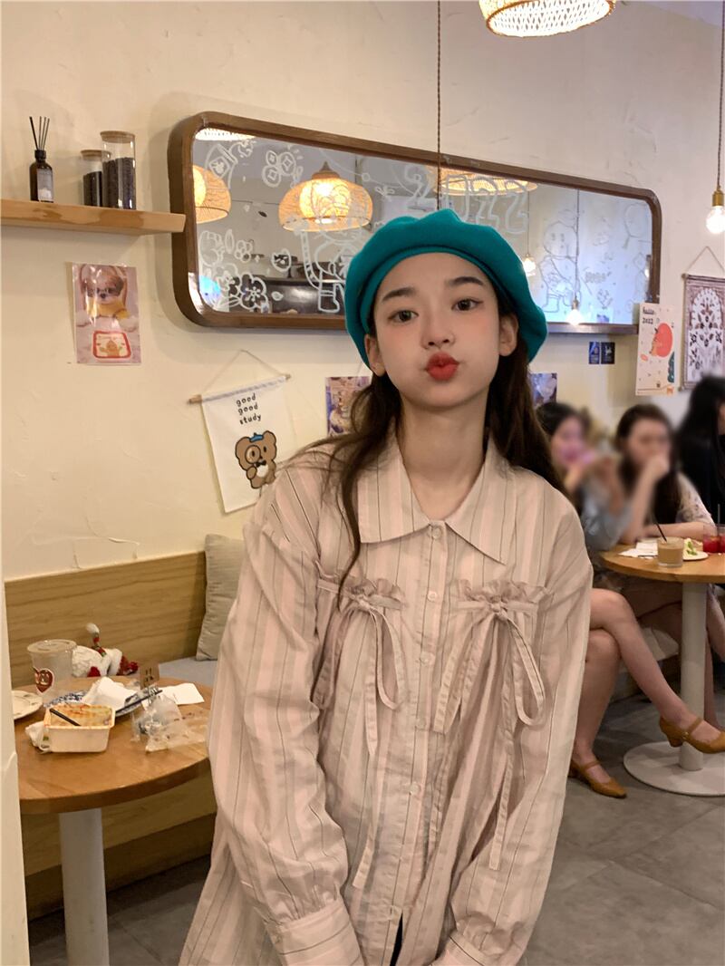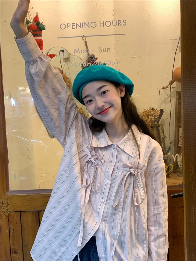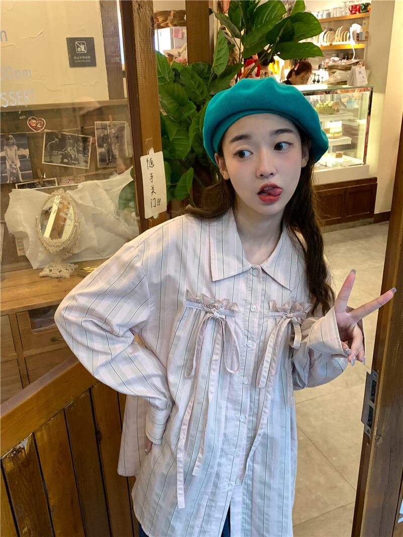 2023春INS★カジュアル 気質 折り襟 リボン 長袖 シャツ/ブラウス
