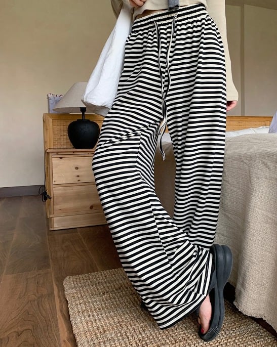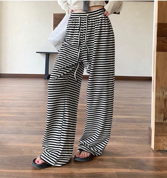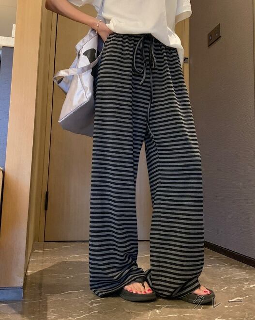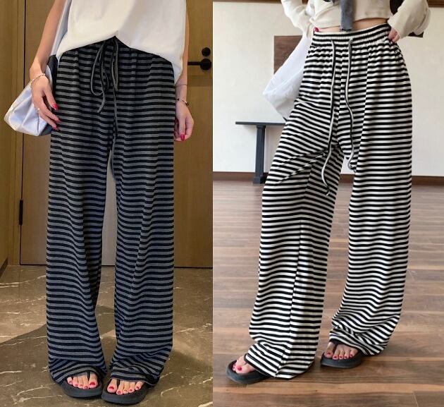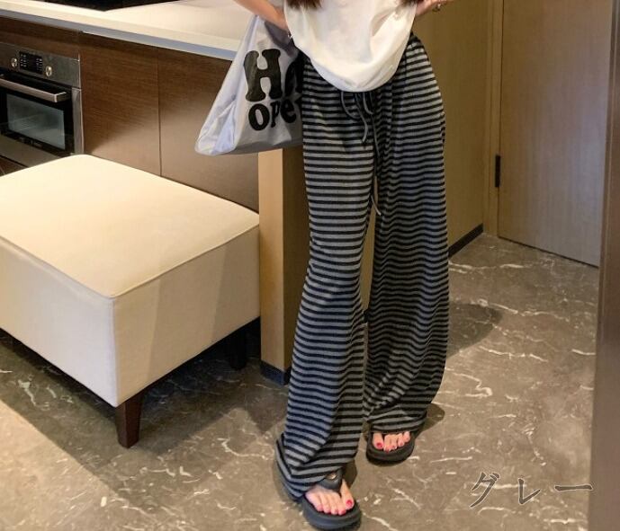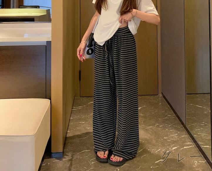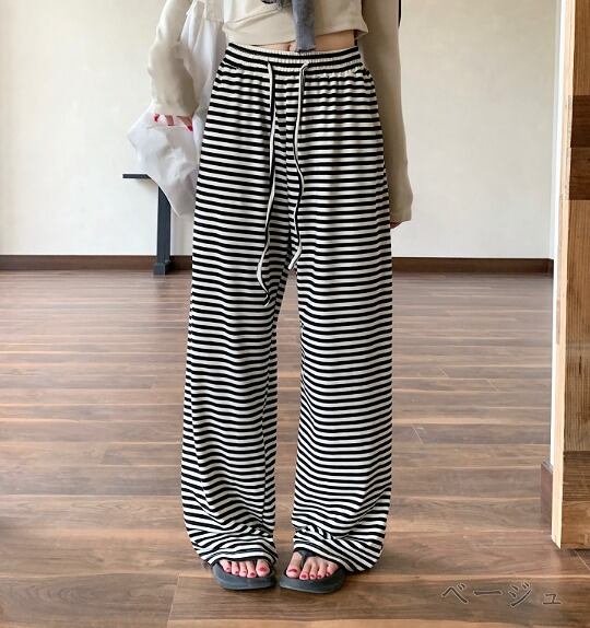 全2色 ワイド バギーパンツ 切り替え バイカラー 体型カバー 着痩せ ボーダー柄 カジュアル