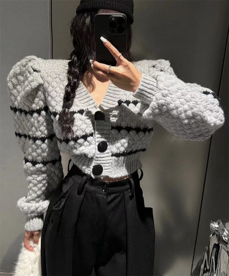2024年春ins 新作 気質 レトロ ニット パフリース カーディガン おしゃれ カジュアル