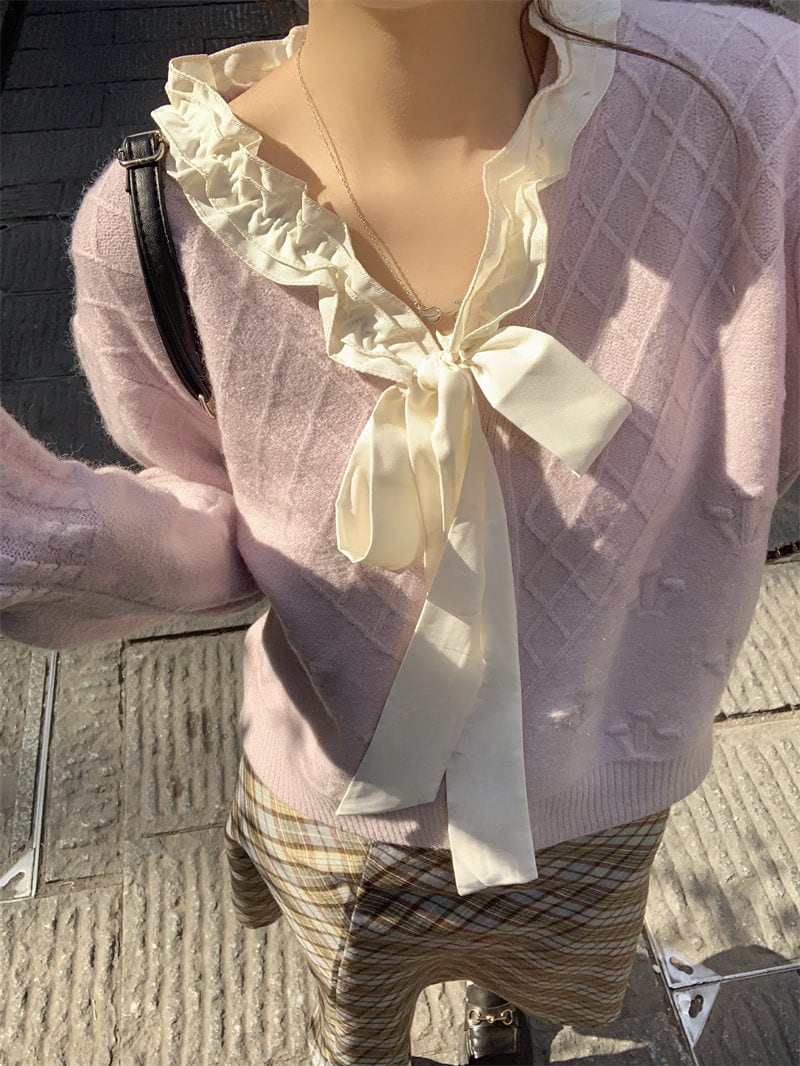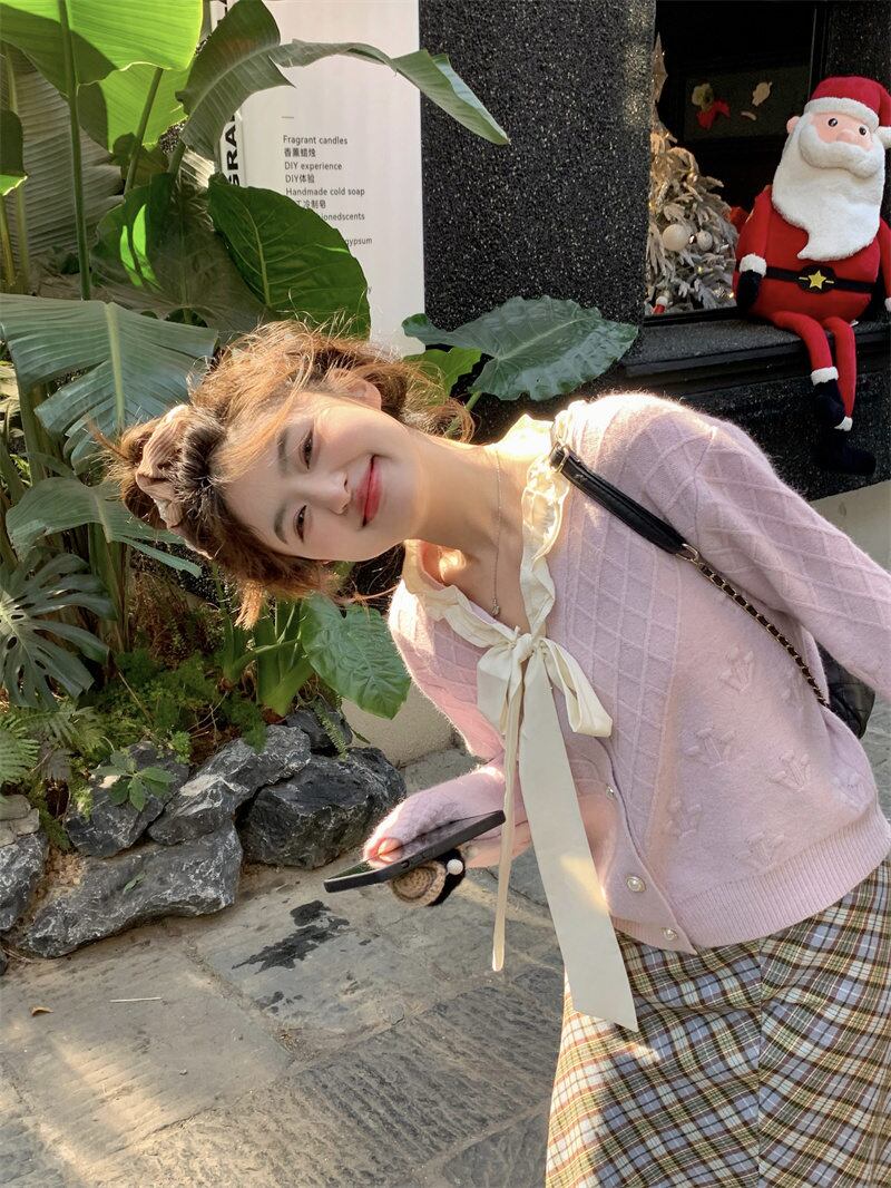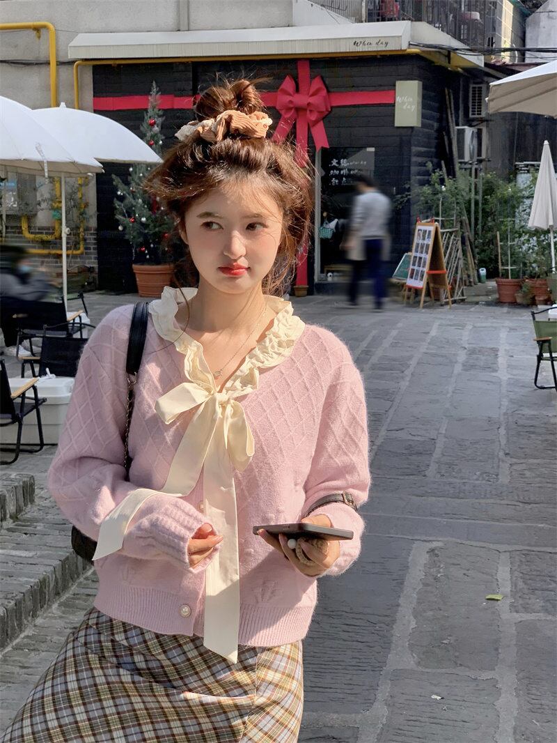 2023年冬新作 レトロ レイジー風 合わせやすい 長袖 ニット生地 リボン カーディガン
